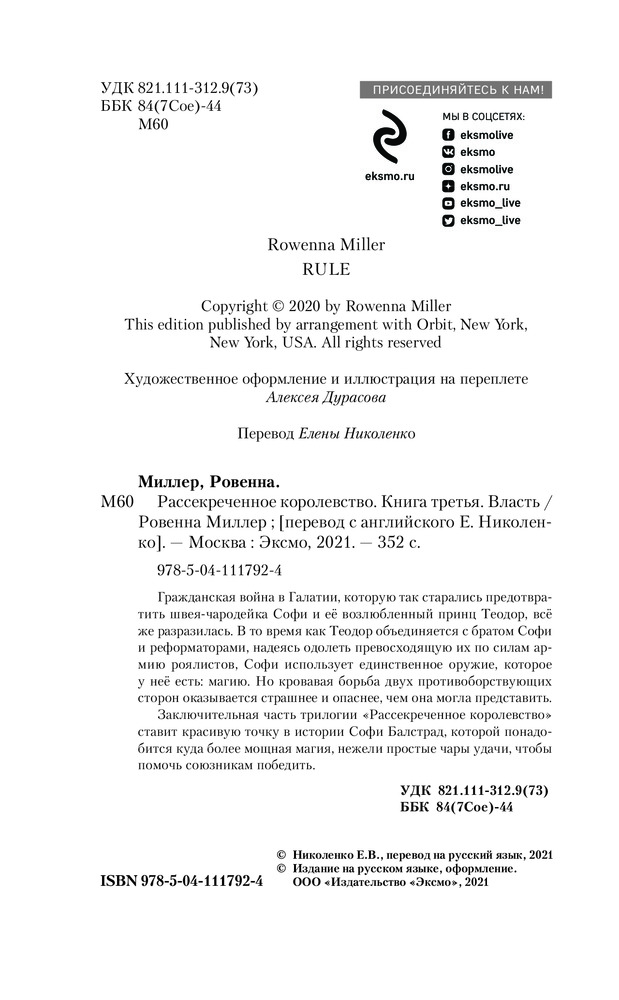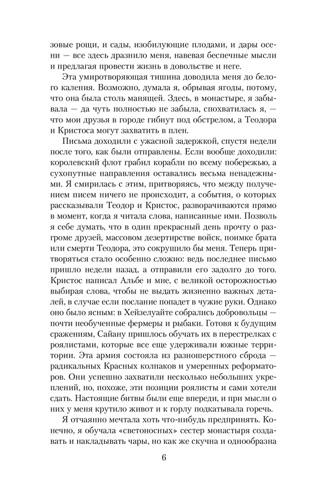 Рассекреченное королевство. Книга третья. ВластьВ данный момент этот товар отсутствует в продаже. Возможно, у нас найдется аналогичный или похожий товар здесь. Серия: Магия чувства. Зарубежное романтическое фэнтези Гражданская война в Галатии, которую так старались предотвратить швея-чародейка Софи и её возлюбленный принц Теодор, всё же разразилась. В то время как Теодор объединяется с братом Софи и реформаторами, надеясь одолеть превосходящую их по силам армию роялистов, Софи использует единственное оружие, которое у неё есть: магию. Но кровавая борьба двух противоборствующих сторон оказывается страшнее и опаснее, чем она могла представить. |