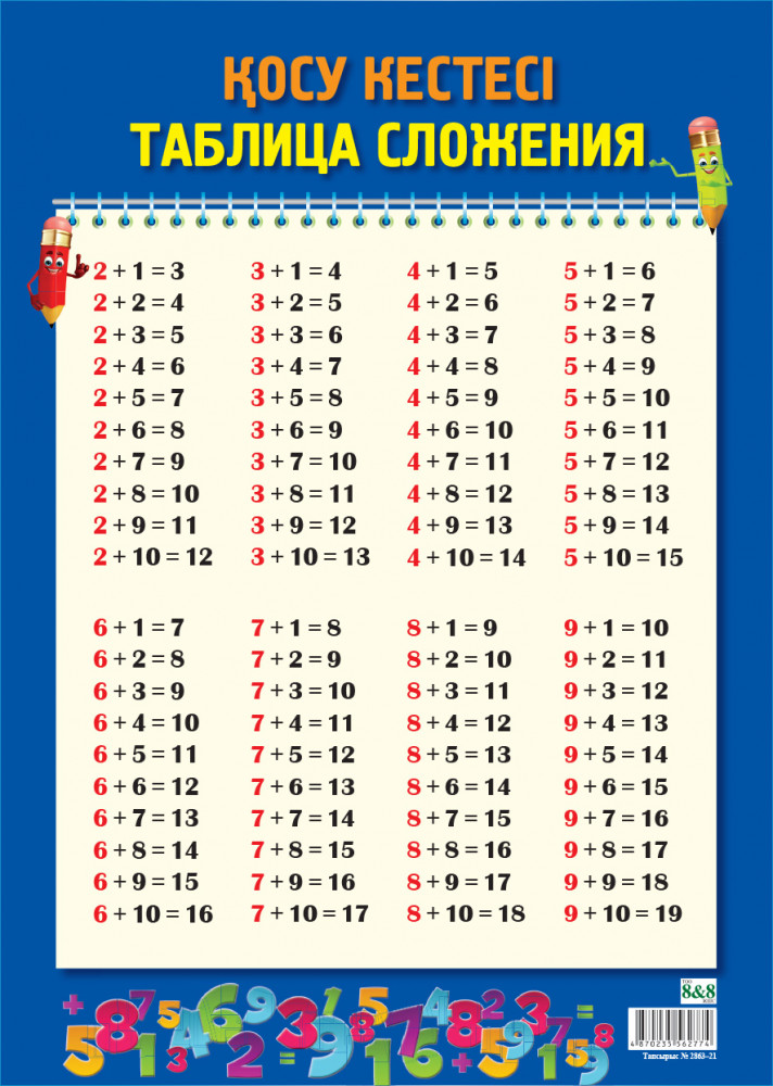 Плакат «Қосу кестесі. Таблица сложения»В данный момент этот товар отсутствует в продаже. Возможно, у нас найдется аналогичный или похожий товар здесь. С помощью этого красочного плаката изучение таблицы сложения для Вашего малыша будет веселым и увлекательным. |
