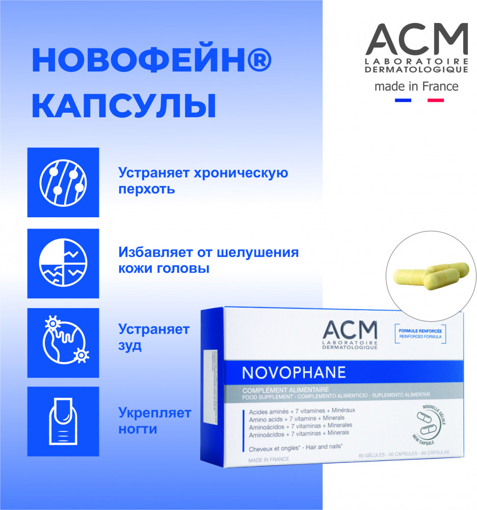ACM Laboratoire Dermatologique Капсулы от выпадения волос «Novophane»В данный момент этот товар отсутствует в продаже. Возможно, у нас найдется аналогичный или похожий товар здесь. Капсулы «Новофан» созданы специально для людей имеющих проблемы с волосами и ногтями. Благодаря сбалансированному составу витаминов и микроэлементов, они помогают справиться с дистрофией ногтевой пластины, ломкостью ногтей, выпадением волос, нарушением их роста, алопецией. |
