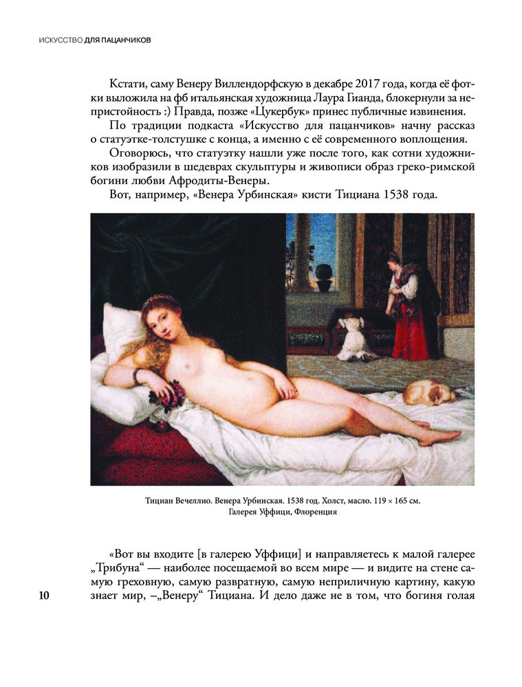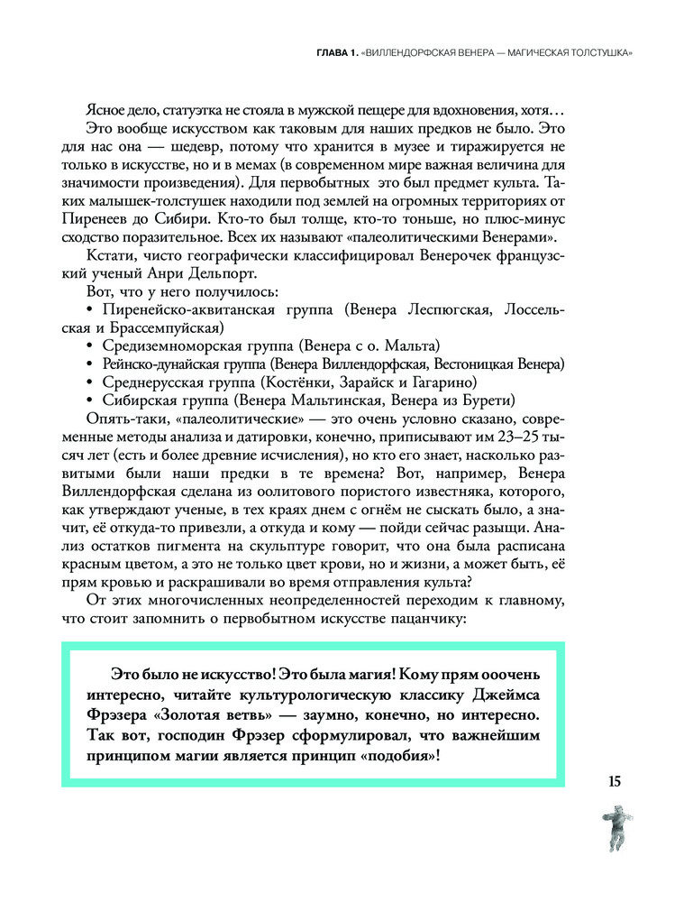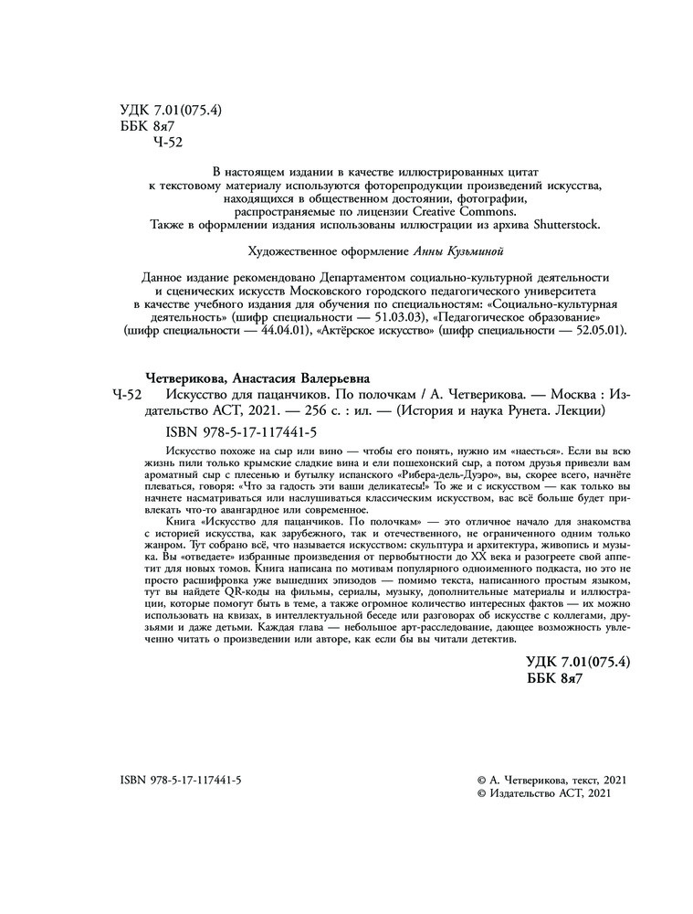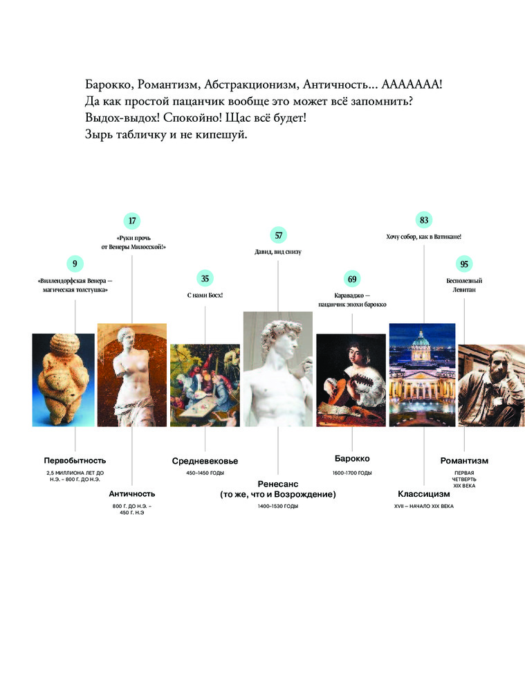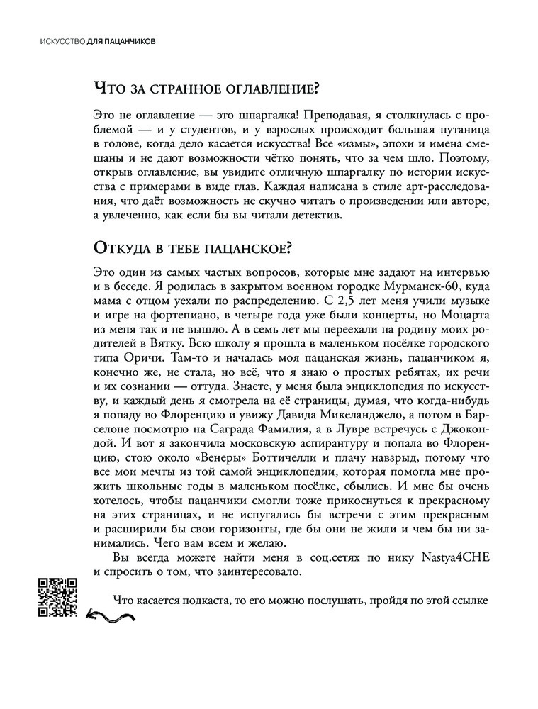Книга «Искусство для пацанчиков. По полочкам» — это отличное начало для знакомства с историей искусства, как зарубежного, так и отечественного, не ограниченного одним только жанром. Тут собрано всё, что называется искусством: скульптура и архитектура, живопись и музыка. Вы «отведаете» избранные произведения от первобытности до XX века и разогреете свой аппетит для новых томов. Книга написана по мотивам популярного одноименного подкаста, но это не просто расшифровка уже вышедших эпизодов — помимо текста, написанного простым языком, тут вы найдете QR-коды на фильмы, сериалы, музыку, дополнительные материалы и иллюстрации, которые помогут быть в теме, а также огромное количество интересных фактов — их можно использовать на квизах, в интеллектуальной беседе или разговорах об искусстве с коллегами, друзьями и даже детьми. Каждая глава — небольшое арт-расследование, дающее возможность увлеченно читать о произведении или авторе, как если бы вы читали детектив.
