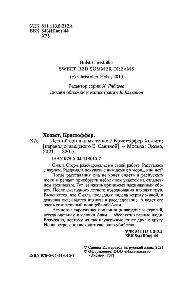 Летний сон в алых тонахВ данный момент этот товар отсутствует в продаже. Возможно, у нас найдется аналогичный или похожий товар здесь. Серия: Tok. Хюгге-детектив Силла Сторм разочаровалась в своей работе. Рассталась с парнем. Раздумала покупать с ним домик у моря... или нет? |