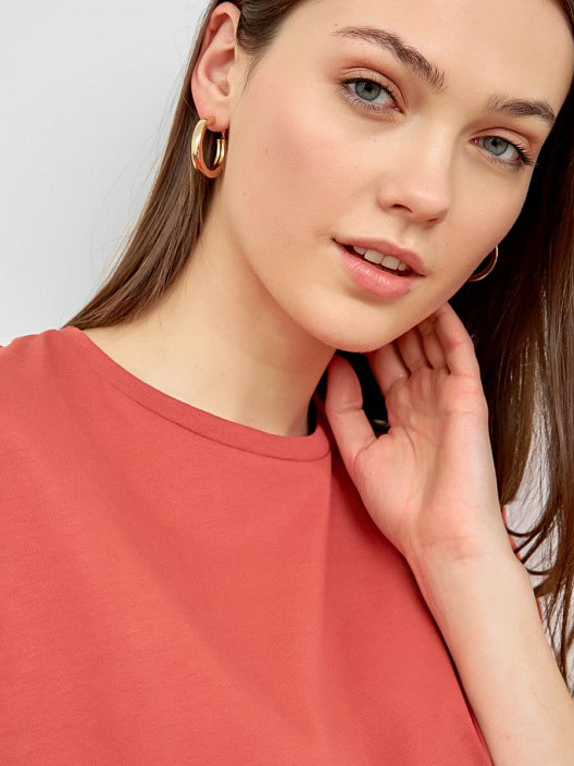 Очень качественный трикотаж и пошив, х/б. Цвет, как на фото, очень понравилась. По размеру - большемерит на 2 размера примерно, на ОБ 104 и ОГ 96 хорошо подошел 44 размер, не в обтяжку.