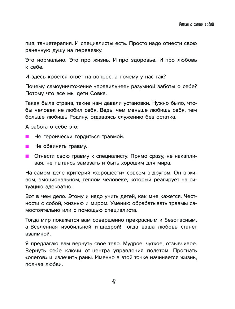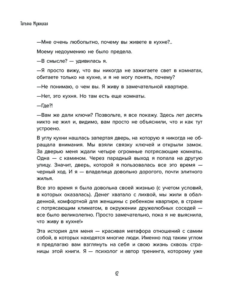 Только недавно открыла для себя писателя, тренера Татьяну Мужицкую. И купила почти все ее книги. Насколько просто и ясно говориться о любви к себе. Как научиться слышать себя, правильно оценивать происходящее, относиться к подаркам судьбы и неудачам. Об этом пишет и рассказывает Татьяна Мужицкая. Книга просто необходима тем, кто живет вдумчиво, а не просто плывет по течению.