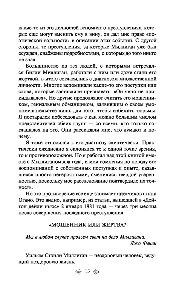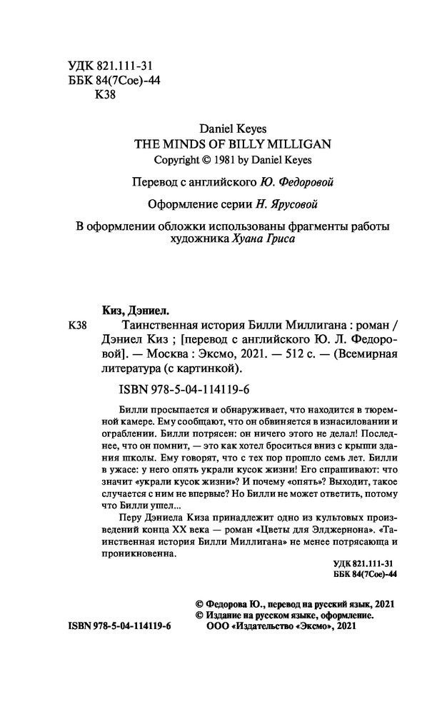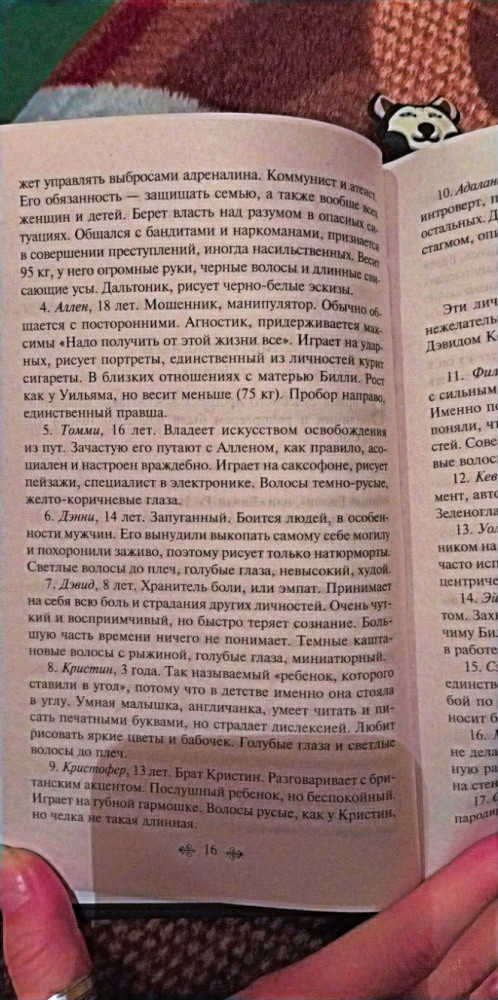 что я могу сказать о книге..забрала вчера и сразу же принялась читать. и я до сих пор потрясена ею. в ней прописаны подробные симптомы, проблемы главного героя. то, с какими трудностями ему пришлось столкнуться в детстве, из за чего это все и произошло с ним. взяла эту книгу по причине того, что я увлекаюсь психологией, мне интересна эта тематика, ну и естественно есть в моей жизни с таким диагнозом. интересно узнать, что происходит с человеком в такие моменты, что он ощущает и ощущает ли что то вообще. автор подробно расписал каждую личность и то, что происходит пока сам Билли якобы "спит". наверняка потребовалось много времени, чтобы все это написать. в предисловии, автор написал, как все происходило. вообщем, я однозначно ставлю этой книге 5 звёзд. пришла целая, хотя сзади есть небольшая царапина. но это мелочь