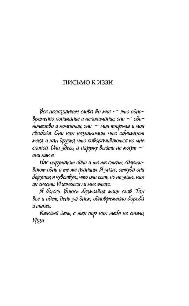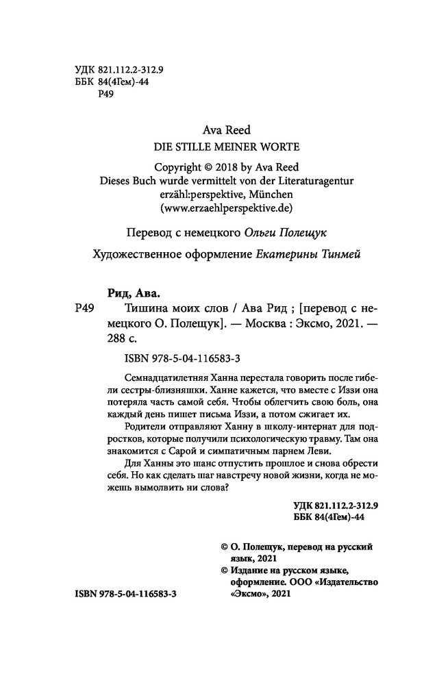 Тишина моих словВ данный момент этот товар отсутствует в продаже. Возможно, у нас найдется аналогичный или похожий товар здесь. Серия: Young Adult. Догоняя мечты. Романы Авы Рид Семнадцатилетняя Ханна перестала говорить после гибели сестры-близняшки. Ханне кажется, что вместе с Иззи она потеряла часть самой себя. Чтобы облегчить свою боль, она каждый день пишет письма Иззи, а потом сжигает их. |