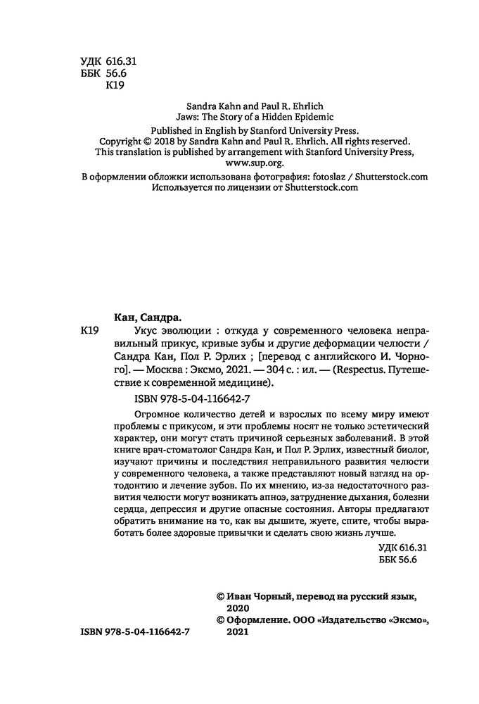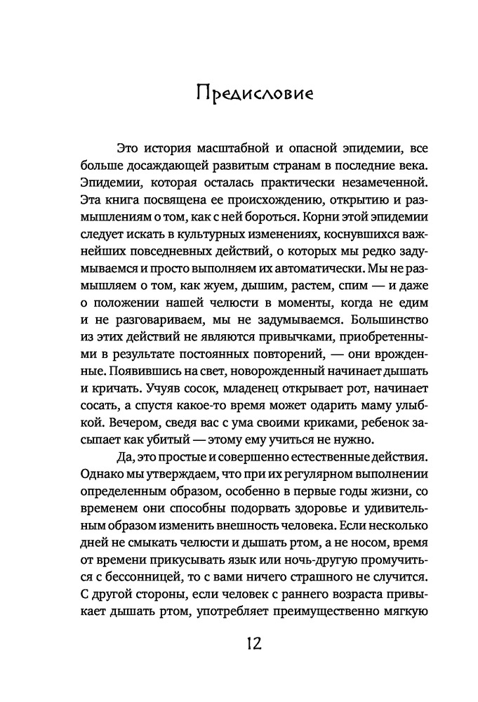 Серия: Respectus. Путешествие к современной медицине Огромное количество детей и взрослых по всему миру имеют проблемы с прикусом, и эти проблемы носят не только эстетический характер, они могут стать причиной серьезных заболеваний. В своей книге врач-стоматолог и доктор медицинских наук, Сандра Кан, и Пол Р. Эрлих, известный биолог и специалист в области демографических исследований, изучают причины и последствия неправильного развития челюсти у современного человека, а также представляют новый взгляд на ортодонтию, профилактику и лечение зубов. По их мнению, из-за недостаточного развития челюсти могут возникать апноэ, затруднение дыхания, болезни сердца, депрессия и других опасные состояния. Они делятся своим новаторским подходом и предлагают простые корректировки (например, переход к более жесткой пище), которые помогут с самого раннего возраста правильно формировать и развивать челюсть, чтобы в будущем у ребенка было крепкое здоровье. Авторы предлагают задуматься и обратить внимание на то, как вы дышите, жуете, спите, чтобы выработать более здоровые привычки и сделать свою жизнь лучше. |
