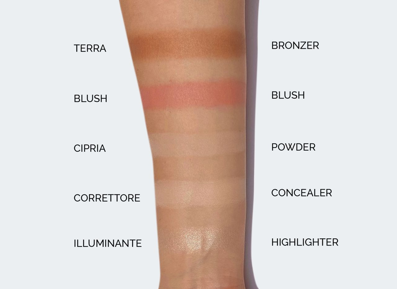 calcium sodium borosilicate, silica, synthetic fluorphlogopite, ci 77019 mica, ci 77891 (titanium dioxide), ci 77491, 77492, 77499 (iron oxides), ci 77007 (ultramarines), ci 77742 (manganese violet), ci 77861 (tin oxide), ci 15850 (red 6, red 6 lake, red 7, red 7 lake), ci 19140 (yellow 5 lake).