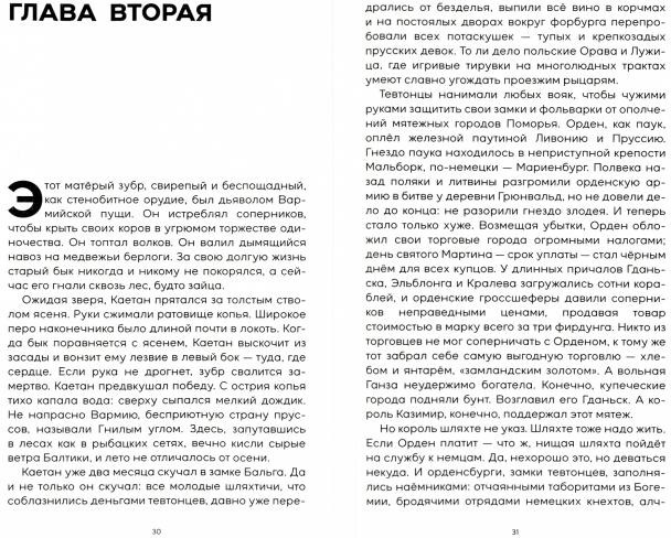 Красивое издание, обложка с лаковыми выпуклыми элементами: тевтонский шлем блестит своими деталями. На форзацах карты с места событий: тевтонские замки 1457 года, восточная Пруссия весны 1945 года. Шрифт крупный, хорошо читаемый, бумага серая (но это полезно для зрения). Книгу только начала читать, начало увлекательное.
