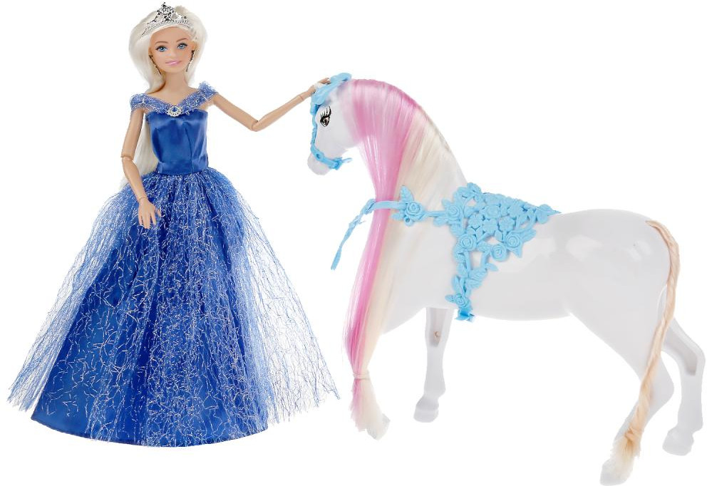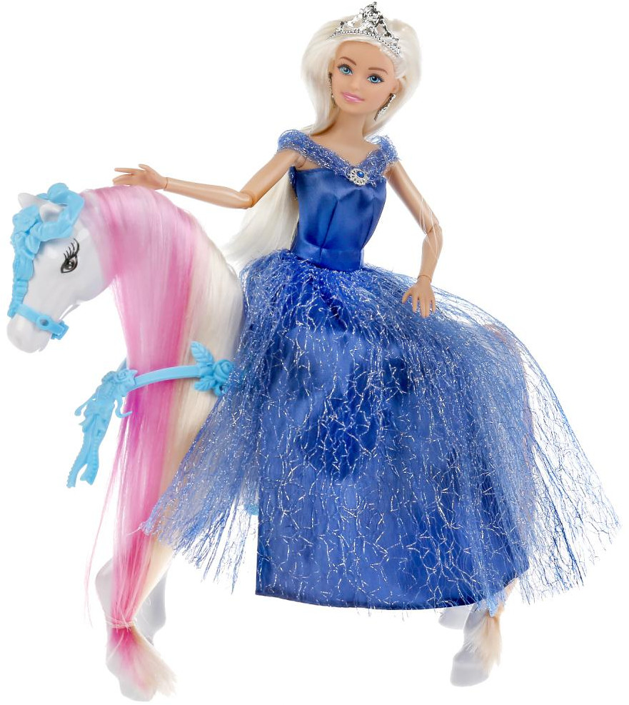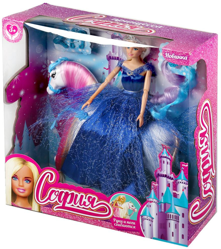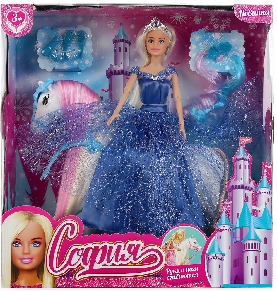 Снежная принцесса София отправляется на прогулку на своей любимой лошадке с длинной гривой и хвостом. Принцесса одета в пышное синее платье до пят, образ дополняют серьги и корона. У Софии длинные и шелковистые волосы, которые можно расчёсывать и создавать разнообразные причёски, необходимые аксессуары для этого имеются в наборе. С такой модной куклой девочке будет интересно и весело играть: благодаря тому, что руки и ноги куклы подвижны (на шарнирах), им можно придать любое положение.