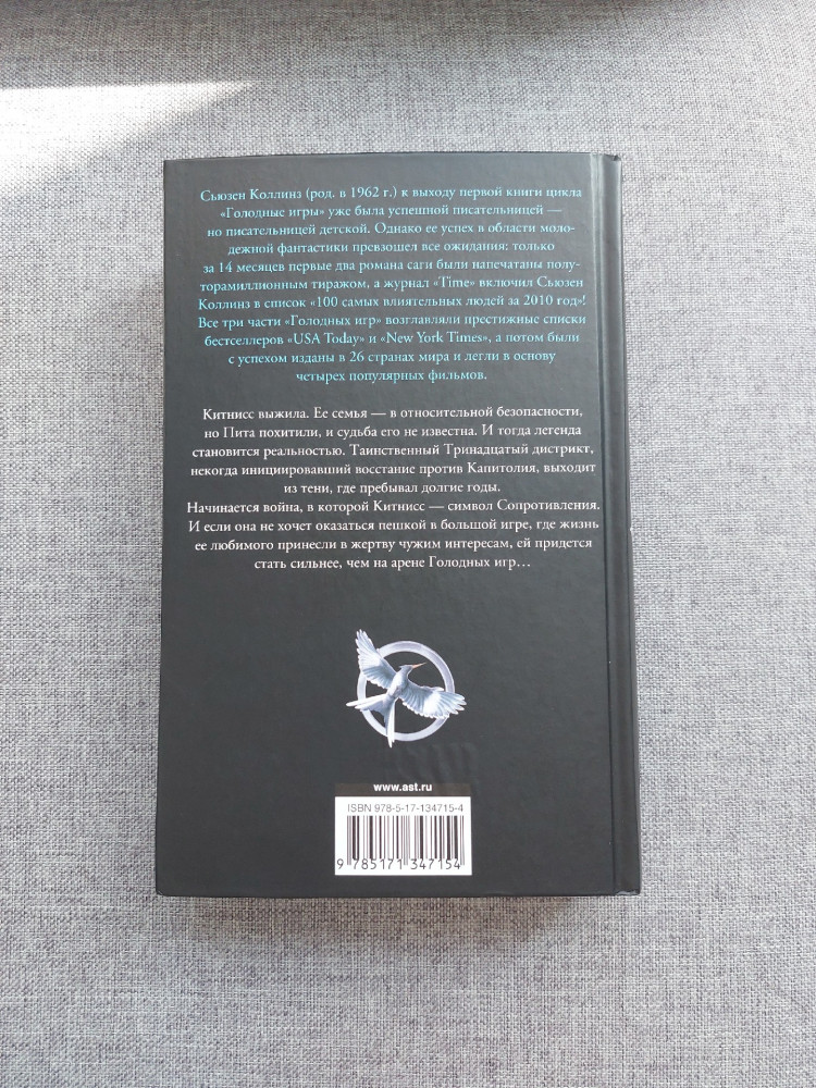 Просто мурашки по коже(глава 7 или 8). Советую посмотреть отрывок на оригинальном языке, где упоминается коронная фраза Китнисс: «Fire is catching. If we burn, you burn with us», тогда то вы и прочувствуете всю жуть этого хаоса. Да, конечно, детали восстания и так помогут вам воспроизвести эту картинку, но благодаря этому вы как будто окажетесь там. По эмоциям пока выигрывает вторая часть трилогии. Там было больше взаимоотношений между героями, а в последней части больше переживаний Китнисс, что тоже неплохо, так как раскрывает ее, как персонажа. Финал слишком разбивающий сердце. Я ожидала этого, но подготовить себя к этому не получилось. !!!Последняя фотка - СПОЙЛЕР!!!