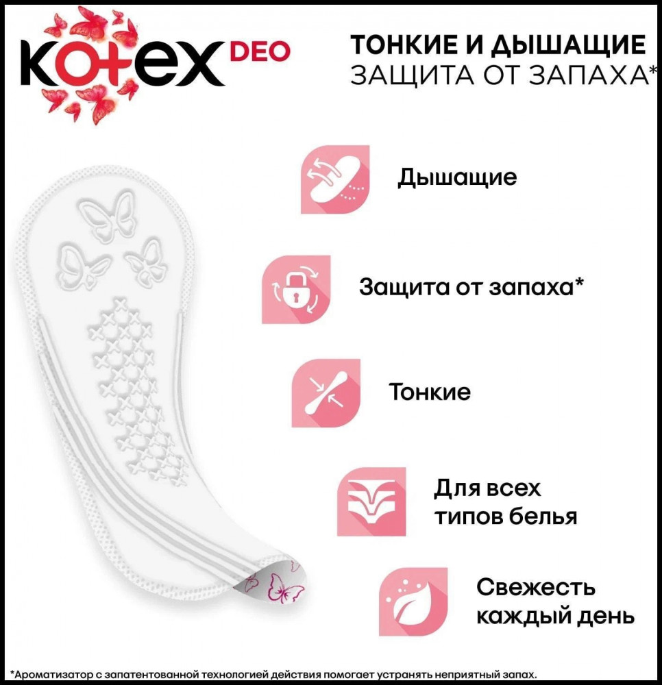💳 Оплатить за товар можно при получении 🇰🇿 Есть бесплатная доставка по Казахстану от 1 дня 🎁 Копите бонусы с каждой покупки Дышащие ежедневные прокладки Kotex помогают чувствовать комфорт и свежесть каждый день! Благодаря гибким краешкам, они подходят для разного типа белья. Прокладки ароматизированные, нейтрализуют запах. Оригинальное тиснение по краям прокладки препятствует ее расслоению, а женственные узоры добавят удовольствия при использовании! |