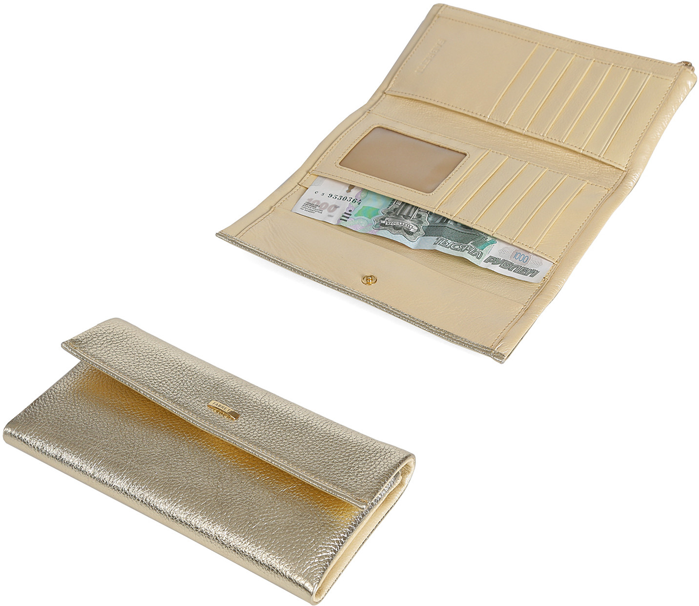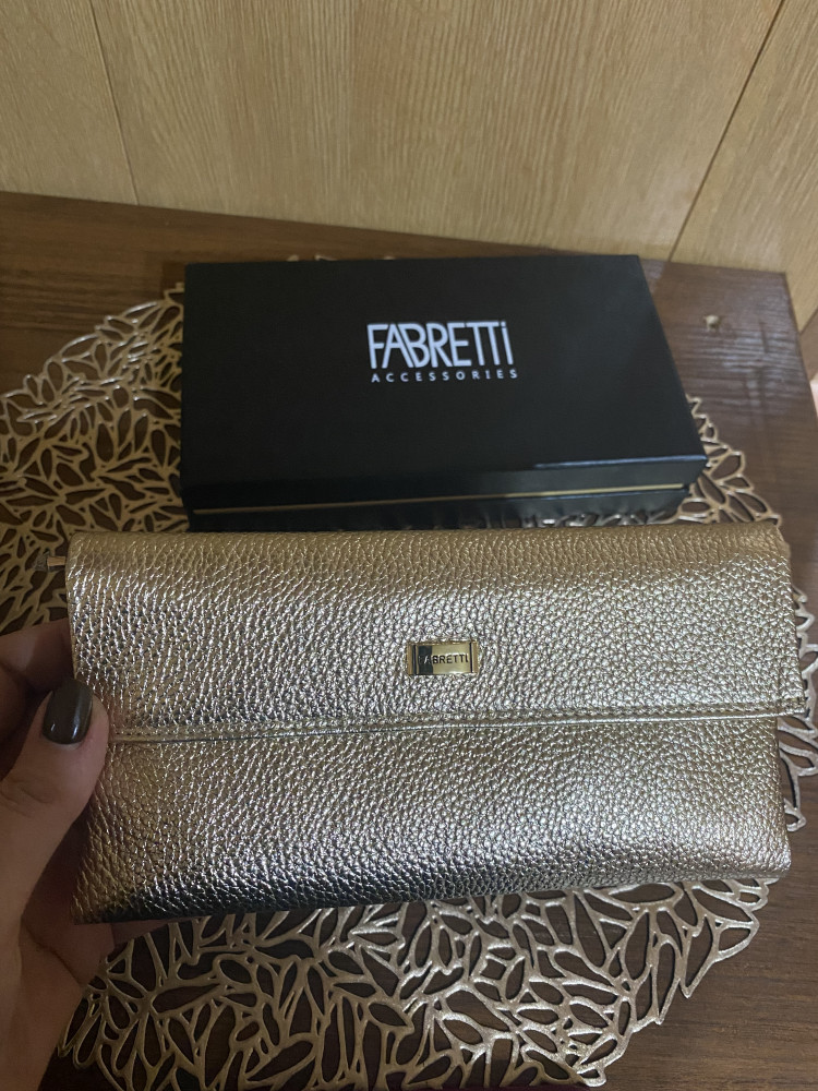 Женский кошелек от итальянского бренда «Fabretti» из натуральной металлизированной кожи. Аксессуар имеет 4 отделения для купюр, 1 отделение для монет на молнии и 14 карманов для дисконтных и банковских карт, закрывается на кнопку. Фурнитура под золото.