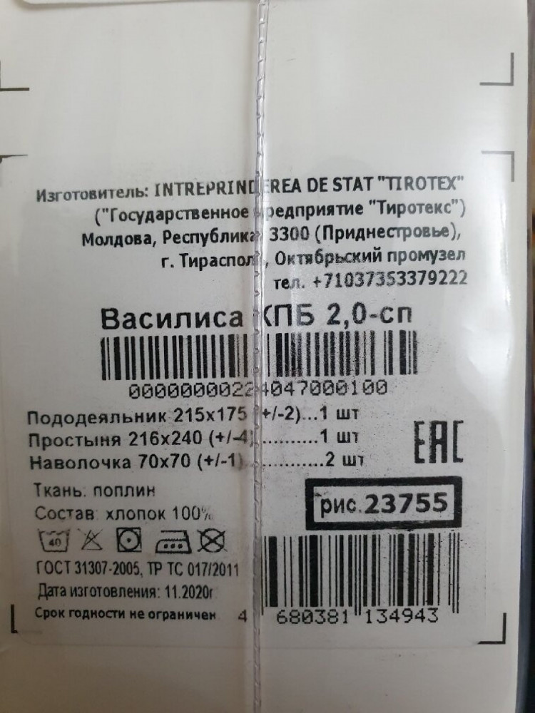 Внешне упаковка соответствует прилагаемой картинке, но меня смутила дополнительная этикетка, которая наклеена внутри защитного целофана упаковки. Данные на этой дополнительной этикетке не соответствуют описанию на сайте и на внутренней части коробки. Производитель указан "Государстенное предприятие "Тиротекст", Республика Молдова, г. Тирасполь. Если у ООО "ТДЛ Текстиль", Россия, г. Иваново есть филиал в Республике Молдова, г. Тирасполь, где производятся изделия этого бренда, считаю корректным указывать конкретно на какой фабрике была изготовлена продукция именно в описании этого изделия на сайте! Лично я как пользователь, люблю и доверяю этому бренду, но я еще не приобретала изделия изготовленные на каких-то других фабриках. Надеюсь качество постельного белья не подведет!
