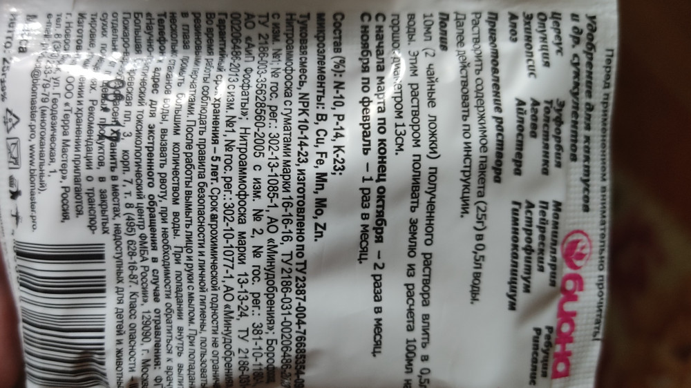 Биона Удобрение комплексное «Кактус»В данный момент этот товар отсутствует в продаже. Возможно, у нас найдется аналогичный или похожий товар здесь. Комплексное удобрениеКомплексное водорастворимое удобрение для кактусов. Используется для корневых и внекорневых подкормок. Формирует устйчивость к хлорозу, грибковым заблолеваниям и неблагоприятным условиям, способствует укреплению корневой системы, обеспечивает активный рост и обильное цветение. |