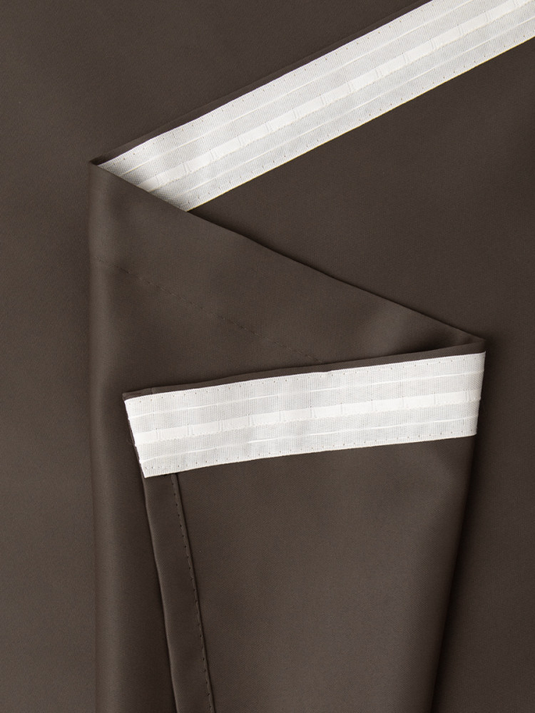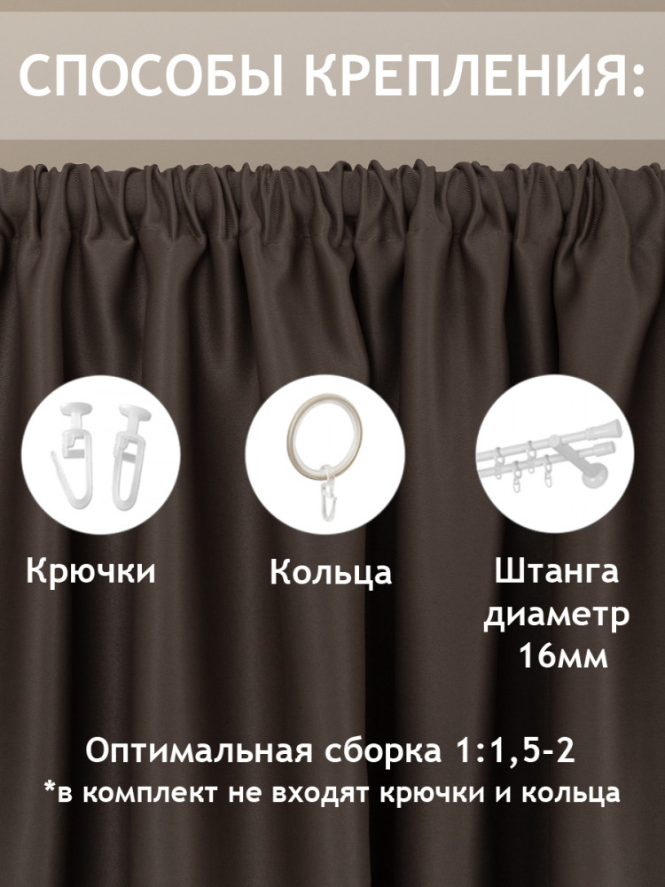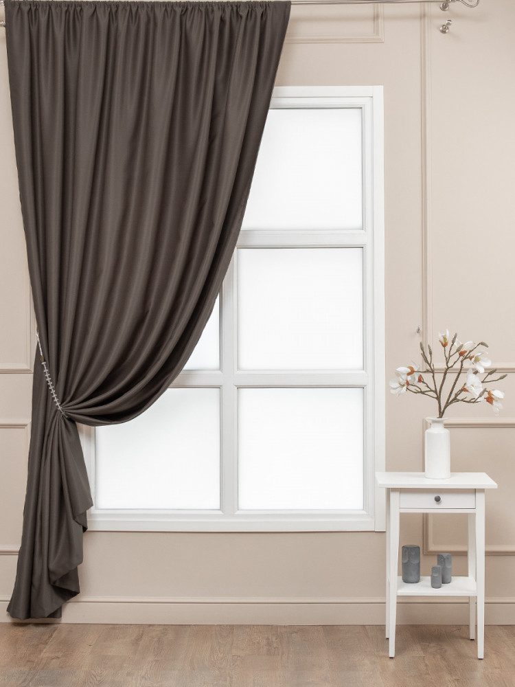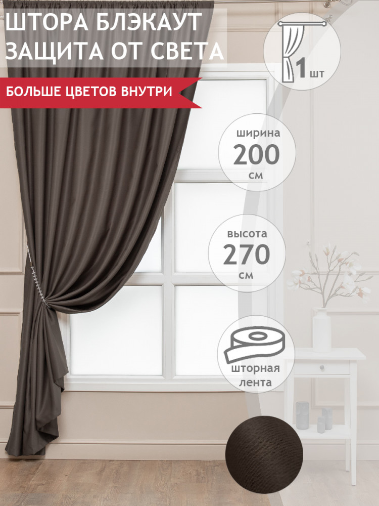 Шторы очень плотные шелковисто- бархатные, прелесть.Цвет немного светлей ( молочного шоколада, ну темнее ).Сшита аккуратно с лентой, свет не пропускает. Довольна .