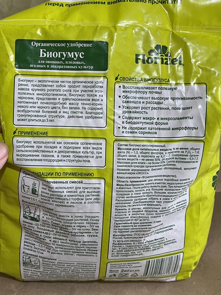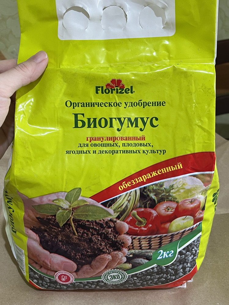 Очень хороший биогумус. Не сухой, гранулированный. Всё как заявлено на упаковке. Дата изготовления указана наверху, на спаечном шве.