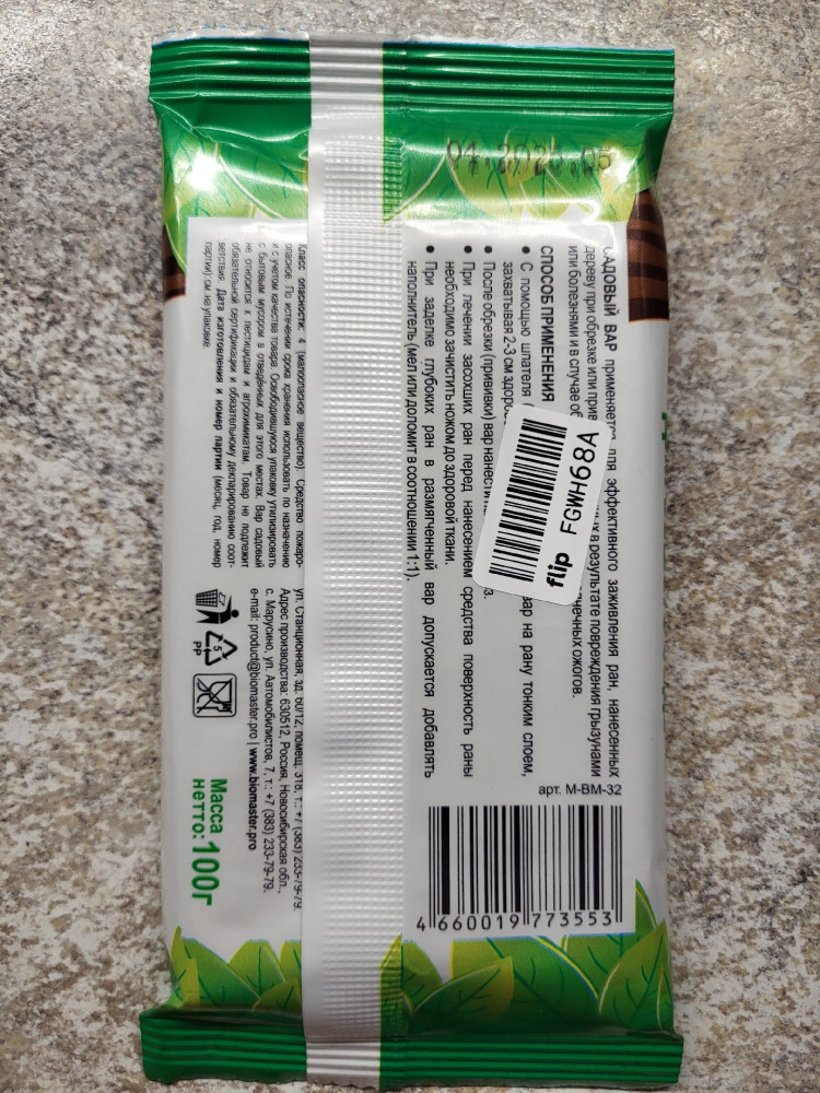 Весьма удобен в использовании, консистенция пластилина, легко наносится и распределяется по поврежденной поверхности коры, выдерживает сезонные температурные перепады не отклеиваясь от древесины. Дерево действительно восстанавливается после залечивания повреждений.