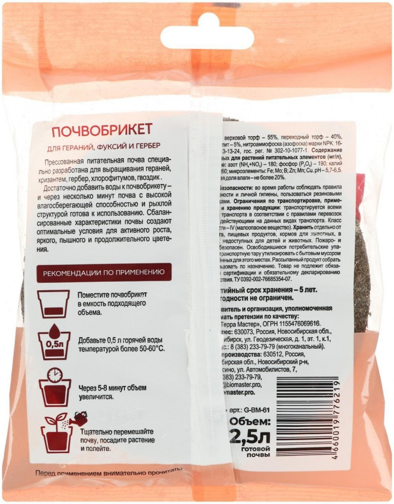 БиоМастер Почвобрикет «Герань»+31 легкий рассыпчатая структура компактный подходит для герани удобный в использовании