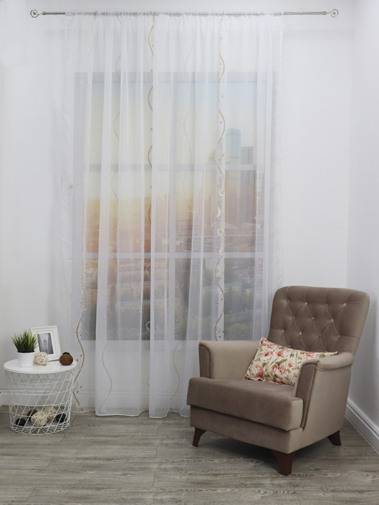Эффектный жаккардовый тюль торговой марки «Amore Mio» из турецкой ткани прекрасно дополнит интерьер как гостиной, так и спальни, кухни или детской комнаты. Основа изделия — мягкая и прозрачная тонкая ткань белого цвета с вертикальным рисунком в виде плавной голубой волны. Благодаря этому сочетанию тюль смотрится нарядно и привлекает внимание. Изделие на шторной ленте и готово к использованию.