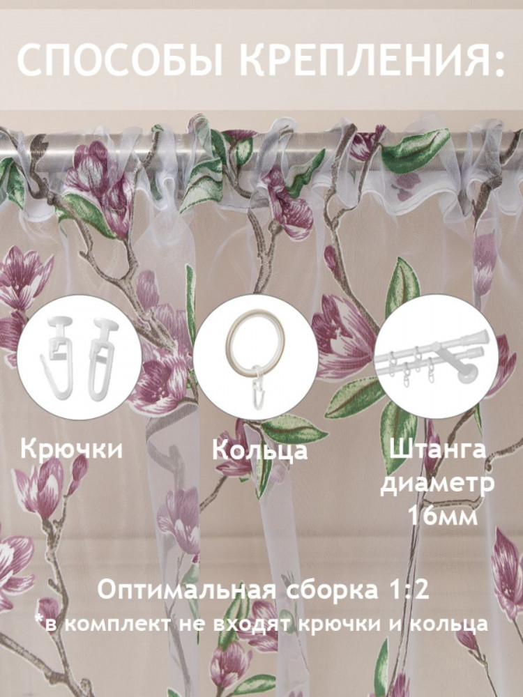 Рекомендации по уходу: ручная стирка или стирка в стиральной машине на деликатном режиме при 30 градусах, не рекомендуется отжимать. Глажка возможна с изнанки негорячим утюгом через влажную марлю. Изделие на шторной ленте и готово к использованию.