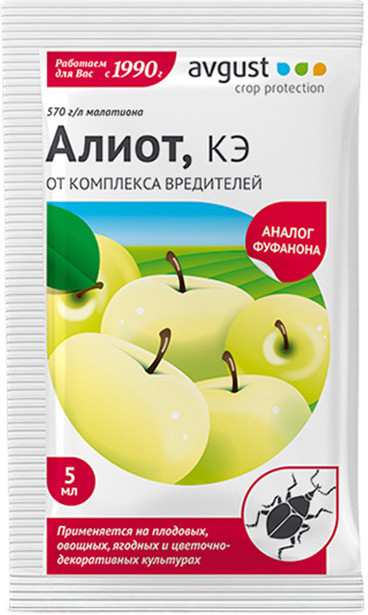 В данный момент этот товар отсутствует в продаже. Возможно, у нас найдется аналогичный или похожий товар  здесь. «Алиот» — один из современных препаратов, который применяется для уничтожения клещей, грызущих и сосущих насекомых на овощных, плодовых, ягодных, цветочных, декоративных культурах и винограде.