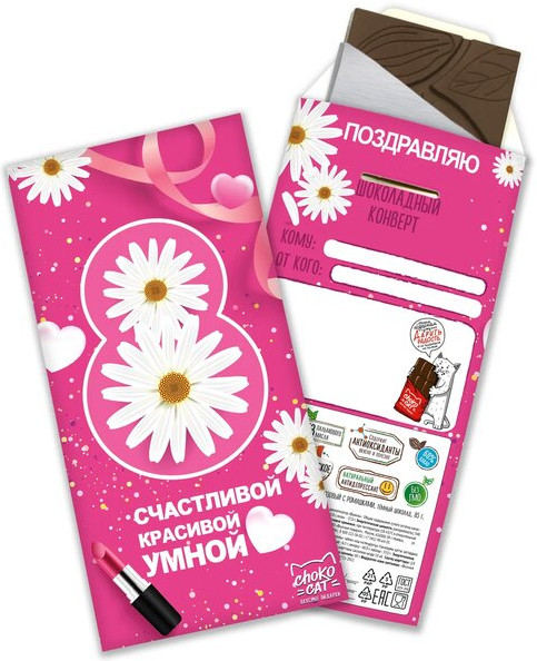 ChokoCat Конверт шоколадный «С ромашками»В данный момент этот товар отсутствует в продаже. Возможно, у нас найдется аналогичный или похожий товар здесь. Серия: Chokonvert Уникальный формат! Обертка — конверт! Открывается сверху и позволяет положить внутрь послание или презент (деньги, сертификат и т.д.). На обратной стороне конверта можно написать адресата послания, отправителя и добрые пожелания. |