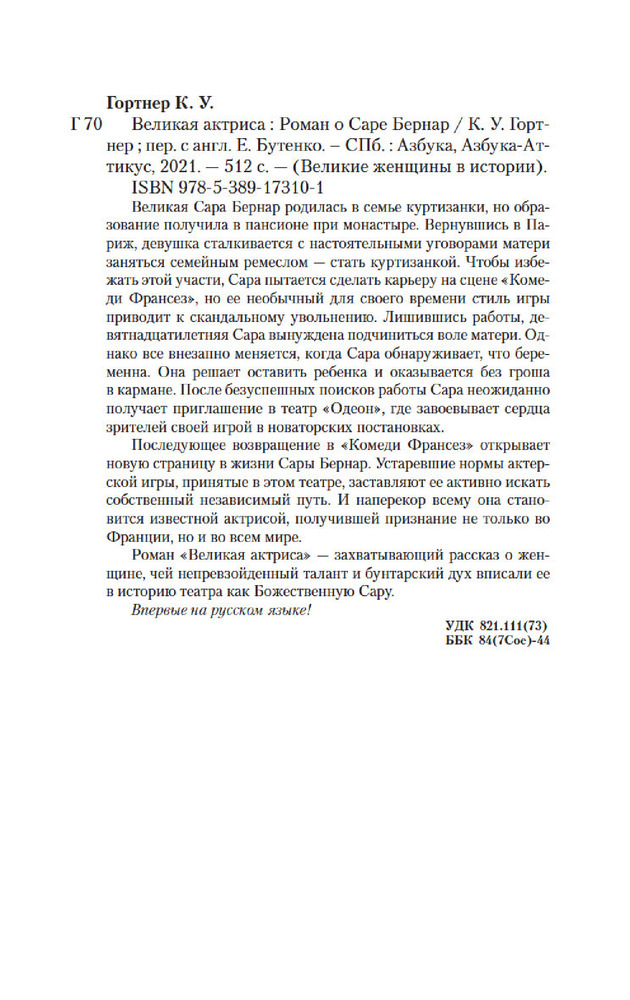 💳 Оплатить за товар можно при получении 🇰🇿 Есть бесплатная доставка по Казахстану от 1 дня 🎁 Копите бонусы с каждой покупки Серия: Великие женщины в истории Великая Сара Бернар родилась в семье куртизанки, но образование получила в пансионе при монастыре. Вернувшись в Париж, девушка сталкивается с настоятельными уговорами матери заняться семейным ремеслом — стать куртизанкой. Чтобы избежать этой участи, Сара пытается сделать карьеру на сцене «Комеди Франсез», но ее необычный для своего времени стиль игры приводит к скандальному увольнению. Лишившись работы, девятнадцатилетняя Сара вынуждена подчиниться воле матери. Однако все внезапно меняется, когда Сара обнаруживает, что беременна. Она решает оставить ребенка и оказывается без гроша в кармане. После безуспешных поисков работы Сара неожиданно получает приглашение в театр «Одеон», где завоевывает сердца зрителей своей игрой в новаторских постановках. |