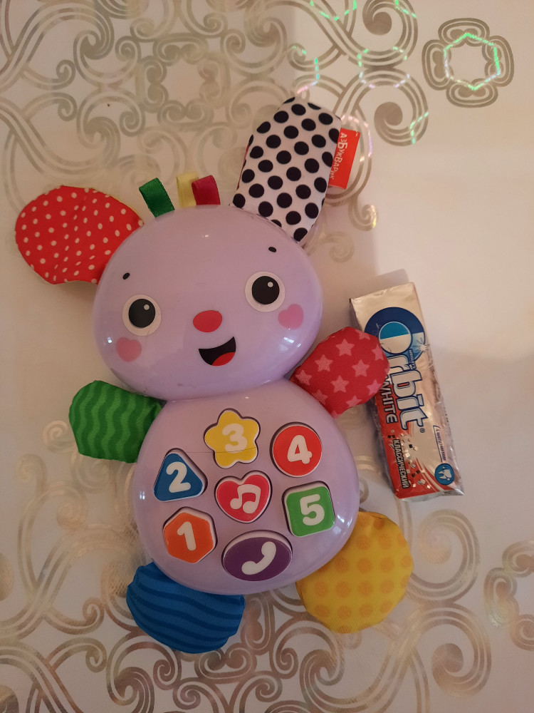 Зайка очень понравился дочке. Музыка не громкая не раздражает. Не большой, поэтому удобно держать детскими ручками. Лапки мягкие, а ушки шуршащие и батарейки в комплекте это плюс.
