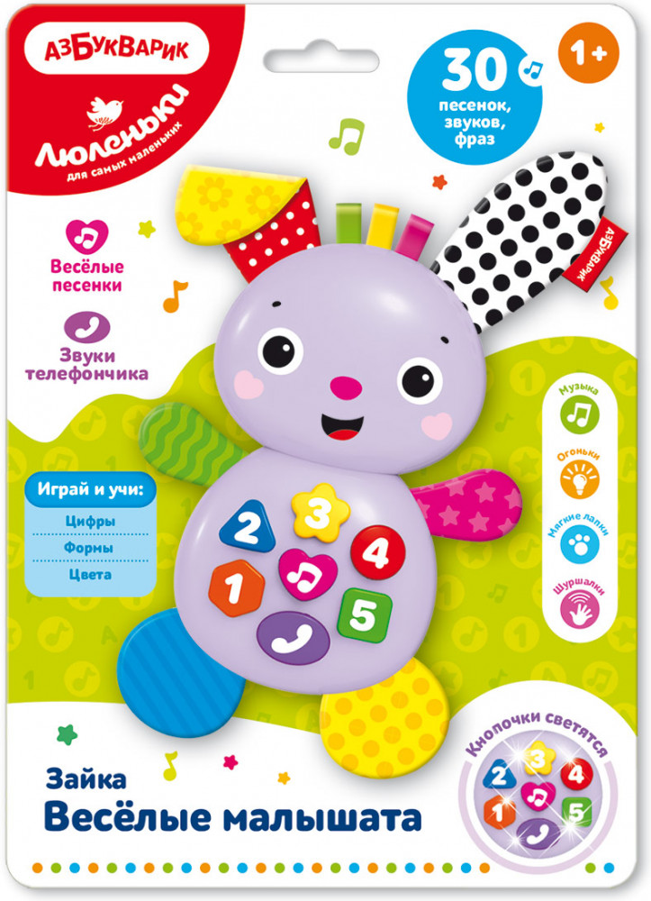 💳 Оплатить за товар можно при получении 🇰🇿 Есть бесплатная доставка по Казахстану от 1 дня 🎁 Копите бонусы с каждой покупки Серия: Люленьки Милый зайка станет для малыша не просто любимой игрушкой, а хорошим другом! Нажимая на кнопочки, ребенок сможет послушать 30 звуков, фразочек, песенок, выучить цифры, формы и цвета, поиграть в телефончик. Огоньки на кнопочках мигают под музыку и создают ощущение праздника. А еще у щенка мягкие лапки и шуршащие ушки, которые так приятно трогать! |