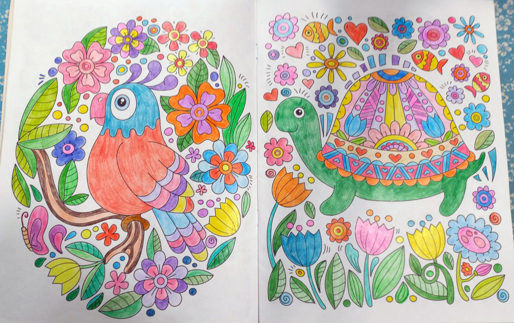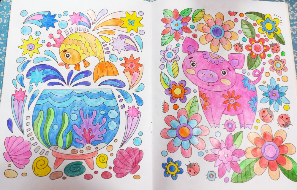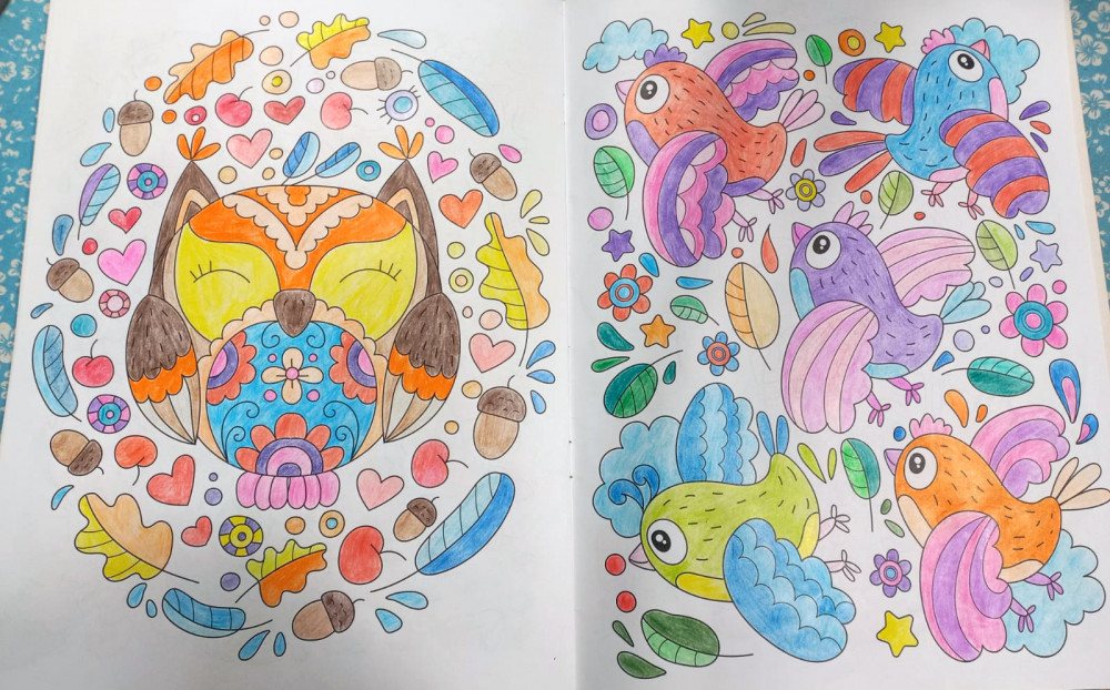 картинки расположены с 2-х сторон, при раскрашивании на обратной стороне отпечатываются карандаши(я подкладываю чистый лист под рисунок)