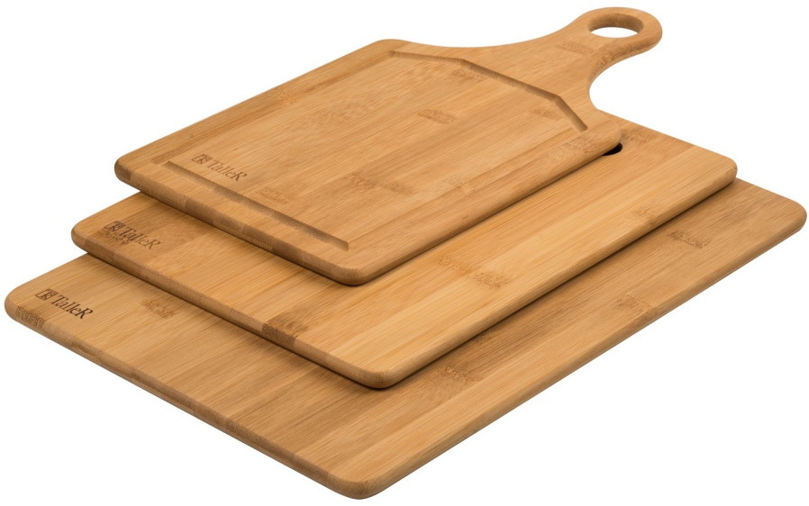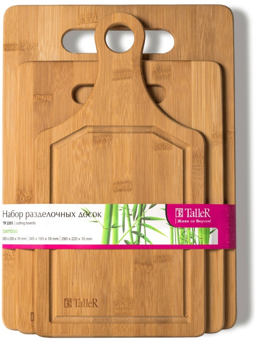TalleR Набор разделочных досокВ данный момент этот товар отсутствует в продаже. Возможно, у нас найдется аналогичный или похожий товар здесь. Доски предназначены для разделывания рыбы, мяса, нарезки овощей, фруктов, колбас, сыра и хлеба. Доски можно использовать для сервировки различных продуктов и блюд, а также в качестве подставок для защиты кухонных поверхностей от горячей посуды (кастрюль, тарелок, сковородок и форм для выпечки). Бамбуковые доски прекрасно подойдут для ежедневного использования. Рекомендуется раз в 3 месяца смазывать доску подогретым растительным маслом. |