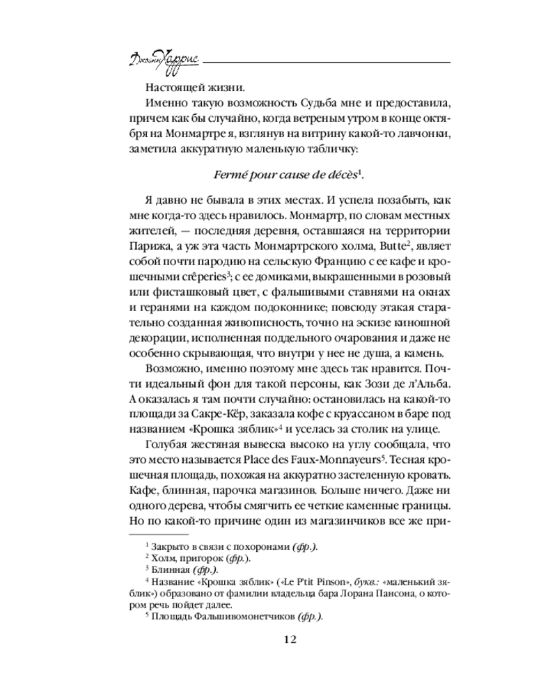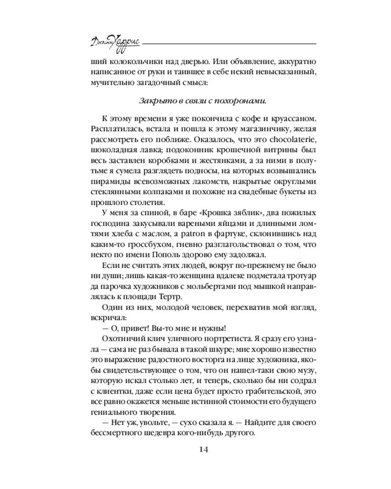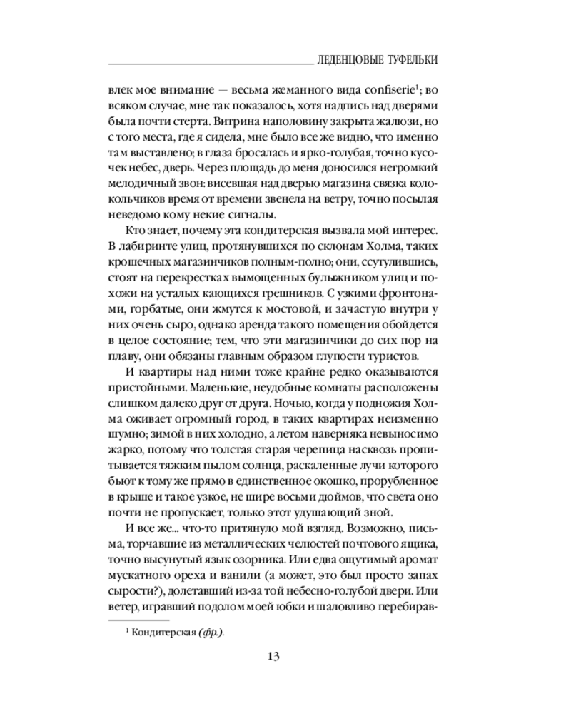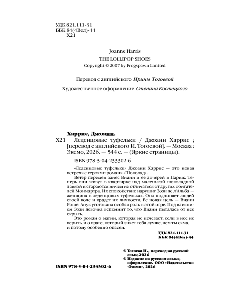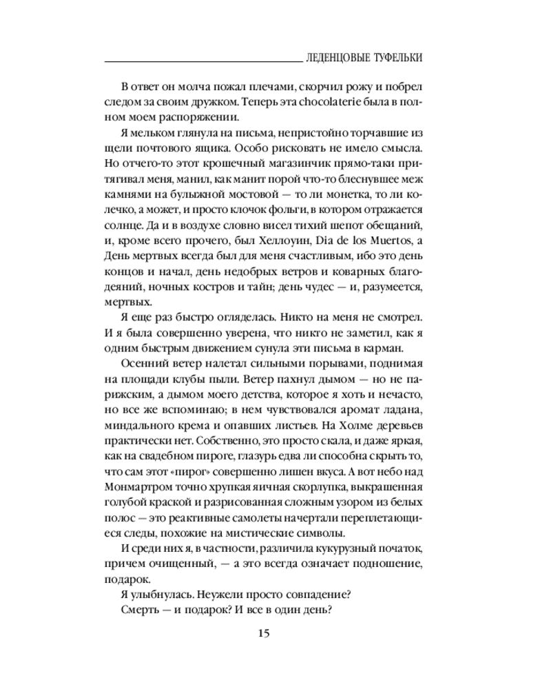 «Леденцовые туфельки» - это 2-я книга известной «шоколадной» тетралогии, на страницах которой вновь встречаемся с героями 1-ой книги «Шоколад», но уже не в маленьком французском городке, а среди жителей Монмартра в Париже… Это прекрасное продолжение истории семьи главной героини Вианн и 2-х ее дочерей… Магический роман о волшебстве, о чувствах и о дружбе…
