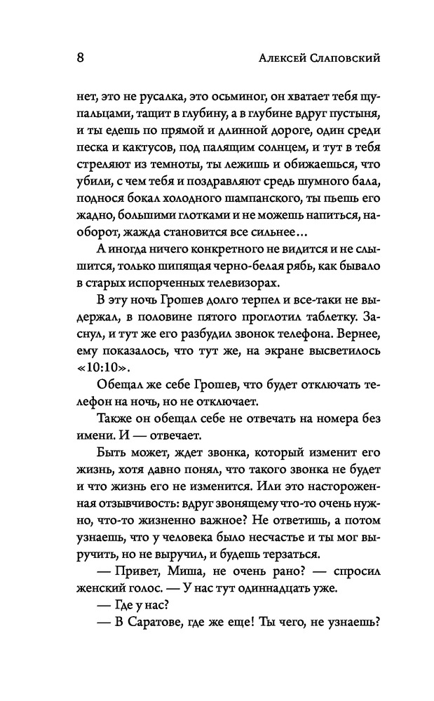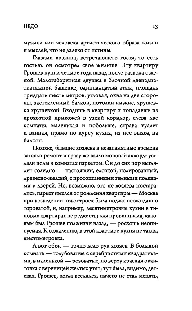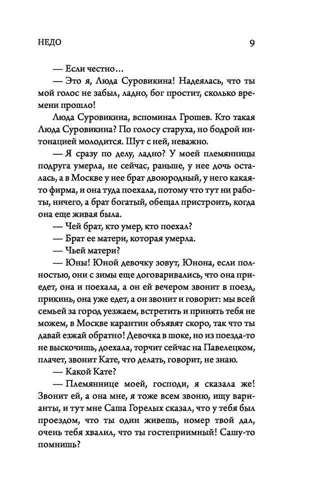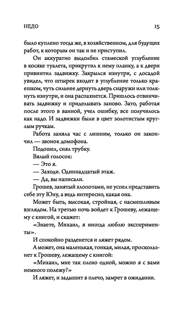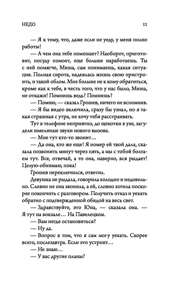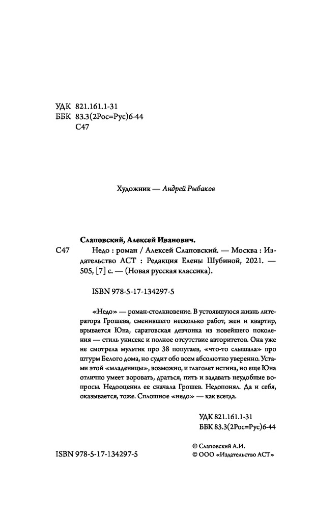 «Недо» — роман-столкновение. В устоявшуюся жизнь литератора Грошева, сменившего несколько работ, жен и квартир, врывается Юна, саратовская девчонка из новейшего поколения — стиль унисекс и полное отсутствие авторитетов. Она уже не смотрела мультик про 38 попугаев, «что-то слышала» про штурм Белого дома, но судит обо всем абсолютно уверенно. Устами этой «младеницы», возможно, и глаголет истина, но еще Юна отлично умеет воровать, драться, пить и задавать неудобные вопросы. Недооценил ее сначала Грошев. Недопонял. Да и себя, оказывается, тоже. Сплошное «недо» — как всегда. |