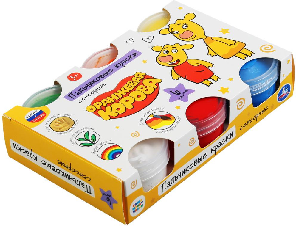 Пальчиковые краски «Оранжевая корова» ТМ «УМка» — отличный вариант для воплощения творческих идей. Смываются водой, сенсорные, яркие цвета, безопасны для детей. Пальчиковые краски незаменимы для творческого развития малыша. Это самые первые краски в жизни ребёнка. Они хорошо наносятся на любые поверхности, совершенно нетоксичны и легко смываются с рук и одежды.