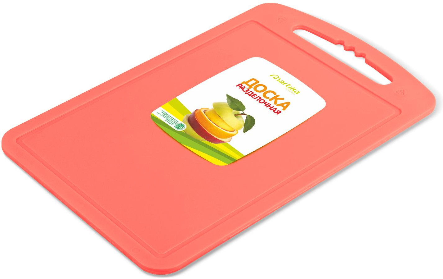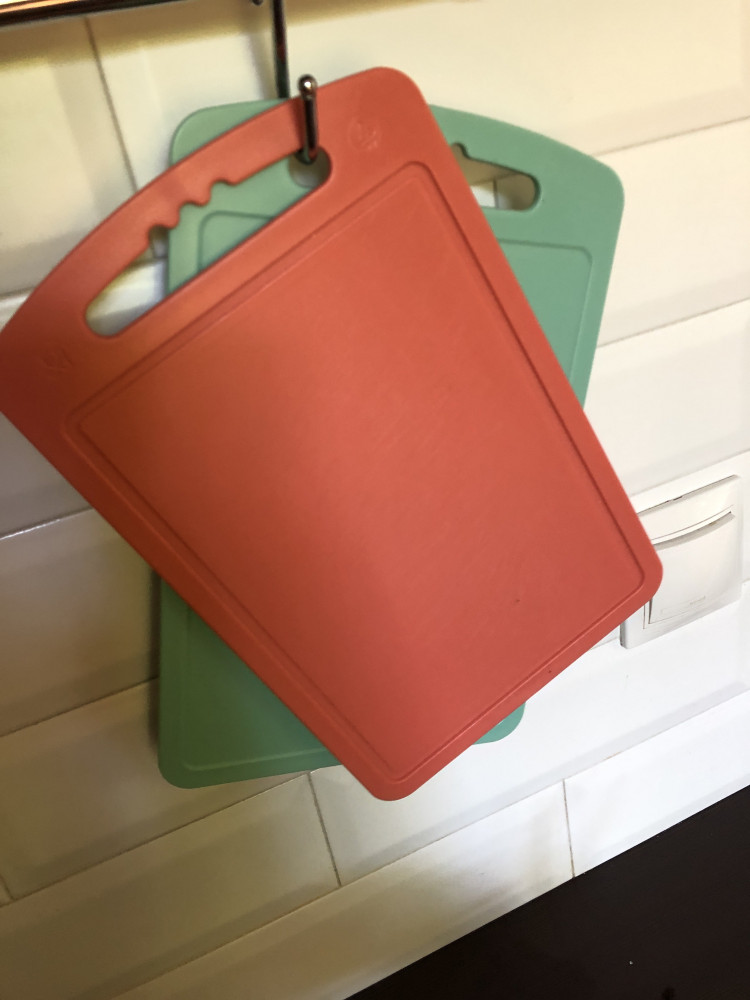 Из плюсов: цена, пластик не гнётся, запаха нет, маленький размер, если дома маленькая столешница. Удобно взять с собой на природу. Из минусов: выступающий бортик с одной стороны доски, скользит по столу и все же размер маловат, вот буквально по паре сантиметров не хватает.