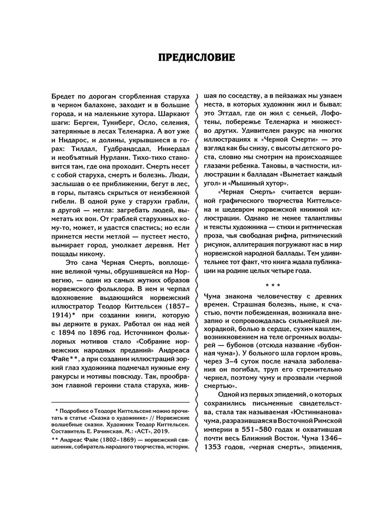 💳 Оплатить за товар можно при получении 🇰🇿 Есть бесплатная доставка по Казахстану от 1 дня 🎁 Копите бонусы с каждой покупки Серия: Скандинавские боги Черная Cмерть — один из самых жутких образов норвежского фольклора, воплощение великой чумы, обрушившейся на Норвегию в 1346–1353 годах и унесшей почти две трети населения. Этому трагическому периоду истории страны выдающийся норвежский художник Теодор Киттельсен (1857–1914) посвятил свою самую знаменитую книгу «Черная Смерть» — пятнадцать баллад с иллюстрациями, на которых чума предстает в образе сгорбленной старухи, идущей по стране с метлой и граблями в руках. «Черная Смерть» считается вершиной графического творчества Киттельсена и шедевром норвежской книжной иллюстрации. |