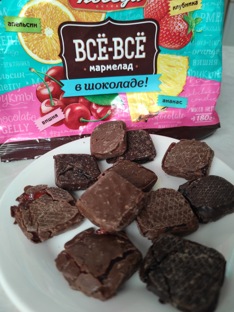 Мармелад в шоколаде были вкусными, но внутри почему то было очень много со вкусом апельсина и яблоко. Попался только 2 штуки со вкусом вишни, а про другие вкусы молчу... Доставка быстрая, обслуживание хорошее