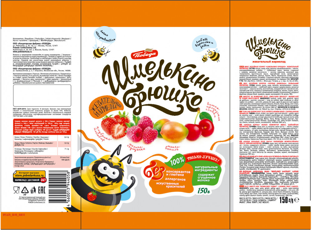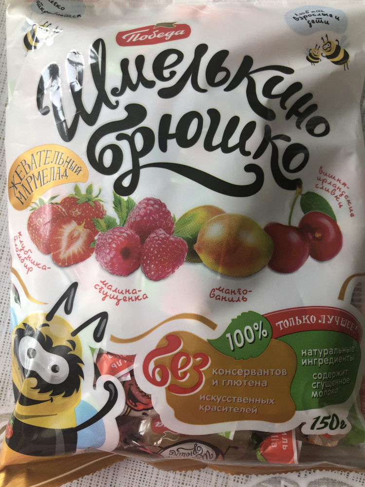 Очень вкусный жевательный мармелад! И манго,и малина,и вишня ,и клубника чувствуются. А оформление-выше похвал! Фантики просто сказка,шмелики-сплошное мимими. Состав более-менее адекватен. Как только появятся снова здесь,обязательно повторю заказ.