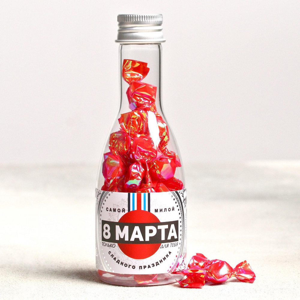 Бутылочка небольшая совсем, но выглядит очень нарядно. Конфетки тоже маленькие, фантики переливаются. На небольшой презент - очень оригинально.
