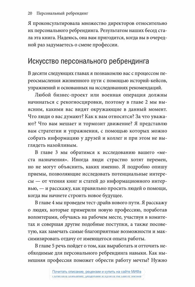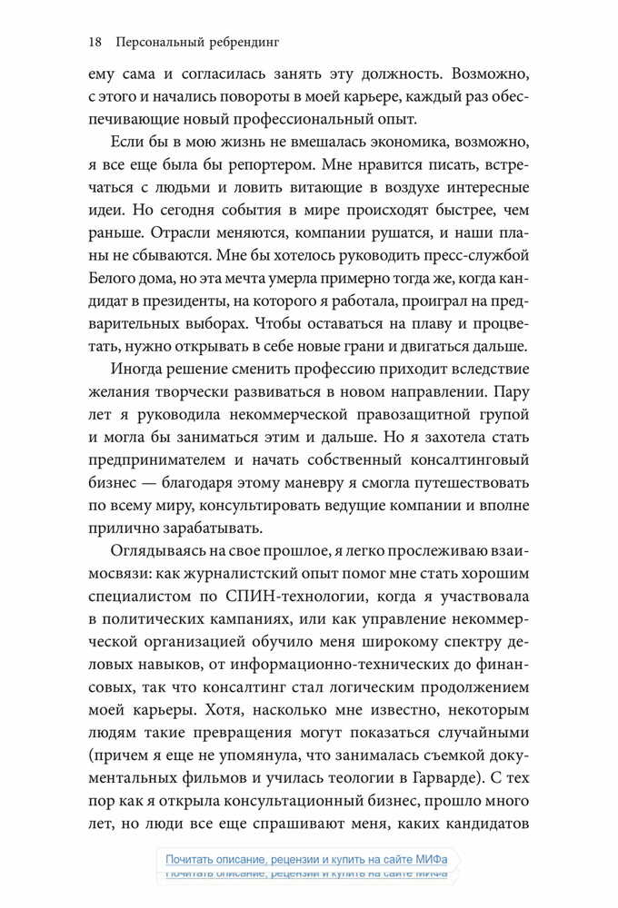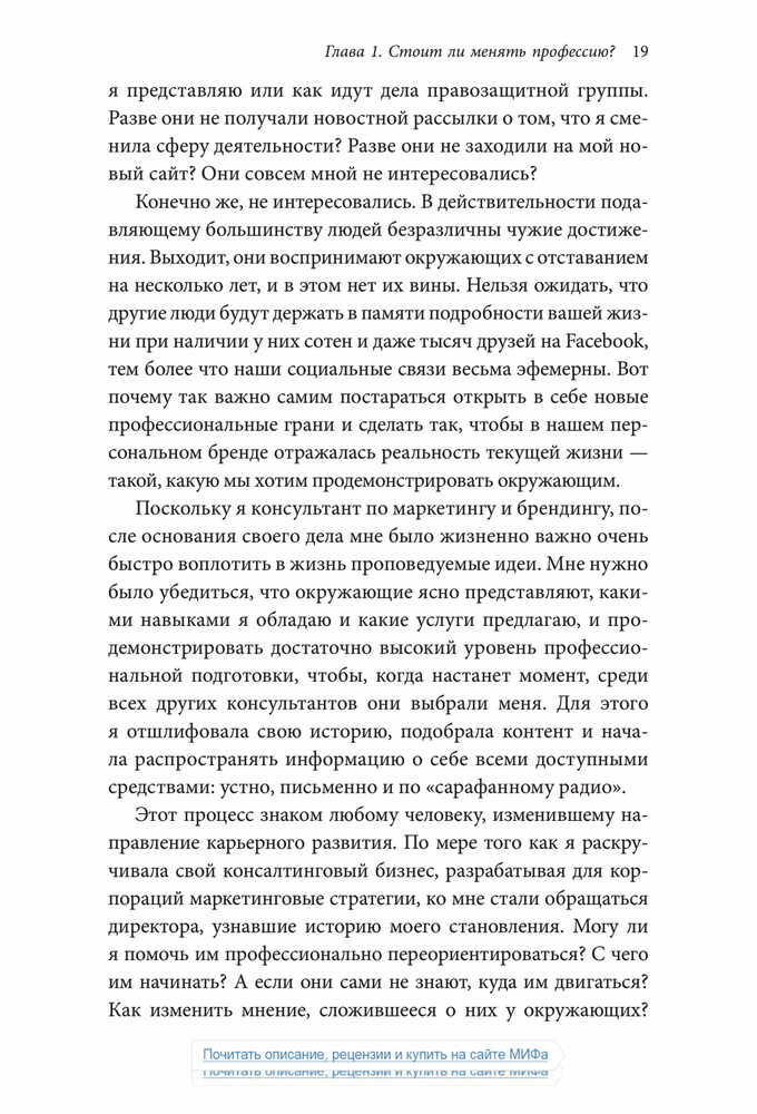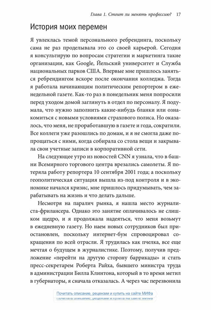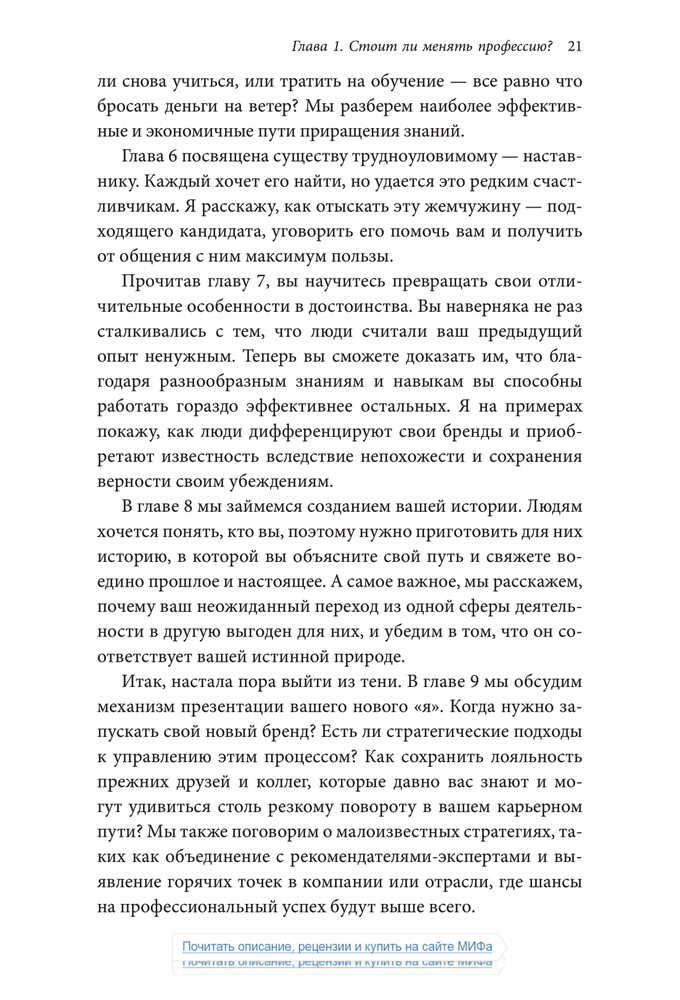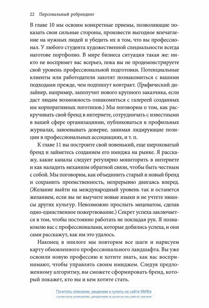 «Чтобы оказаться успешным на современном рынке труда, где царит жесточайшая конкуренция, и сделать карьеру, опираясь на свои склонности и таланты, в какой-то момент вам наверняка придется сменить профессию — и заставить окружающих увидеть и оценить ваш потенциал. Старая тактика — сидеть в своем углу, усердно трудиться и ждать, пока вас заметят, — больше не работает.».
