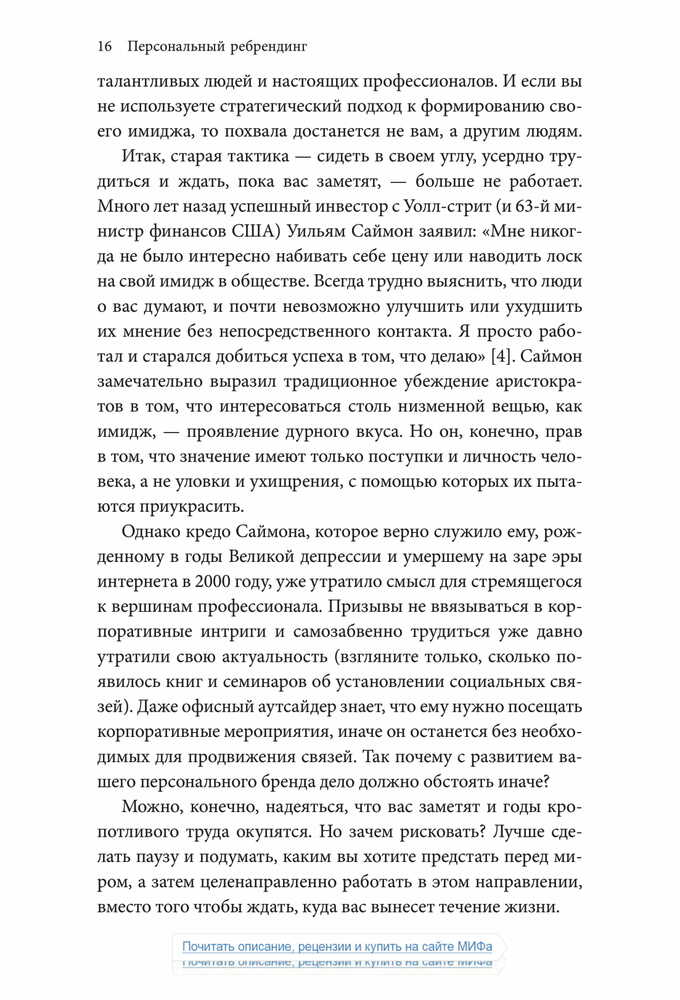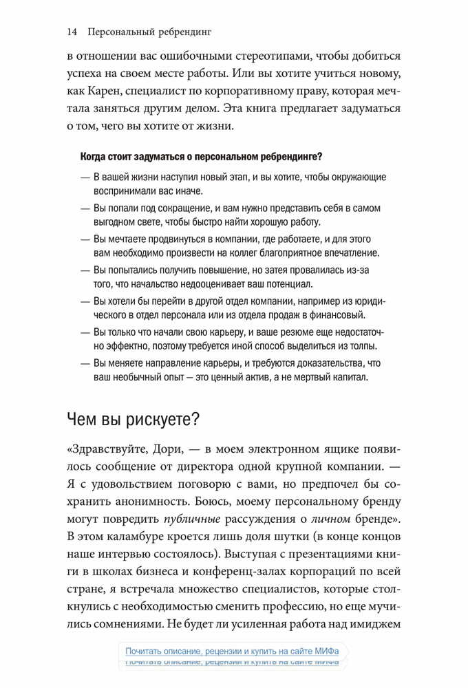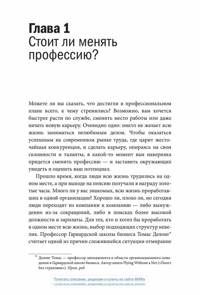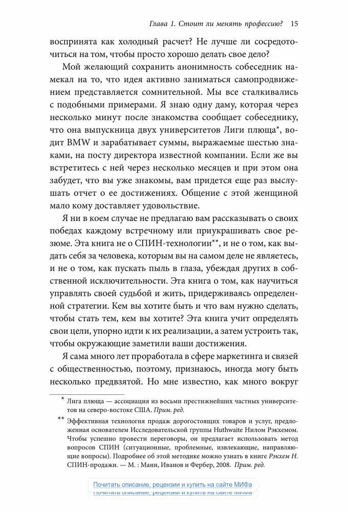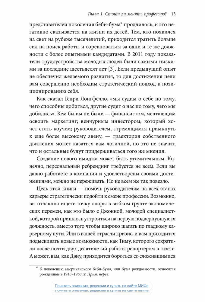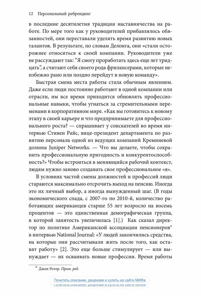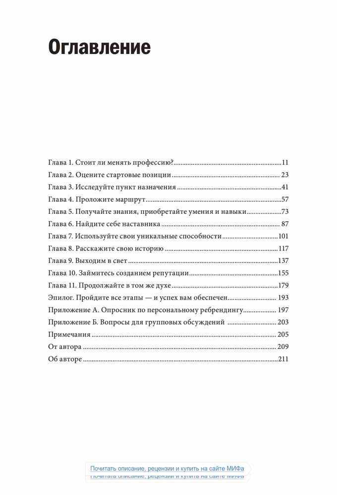 «Чтобы оказаться успешным на современном рынке труда, где царит жесточайшая конкуренция, и сделать карьеру, опираясь на свои склонности и таланты, в какой-то момент вам наверняка придется сменить профессию — и заставить окружающих увидеть и оценить ваш потенциал. Старая тактика — сидеть в своем углу, усердно трудиться и ждать, пока вас заметят, — больше не работает.».