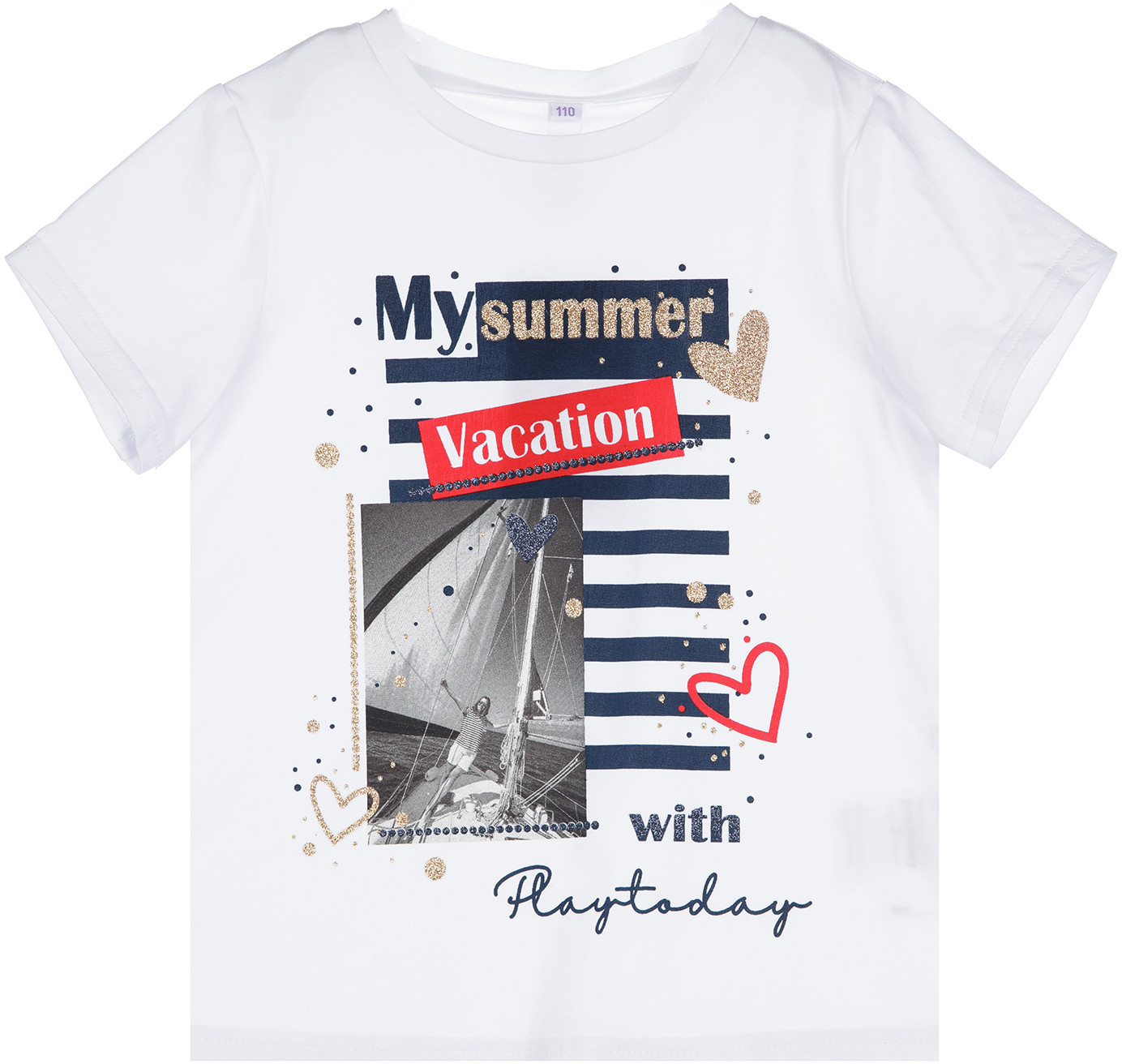 Футболка яркая, очень хорошо в комплекте с шортиками в синюю полоску. Я сначала приобрела шортики, на фото модель была в данной футболочке, потом заказала футболку. Получился отличный комплект. Рекомендую к покупке.