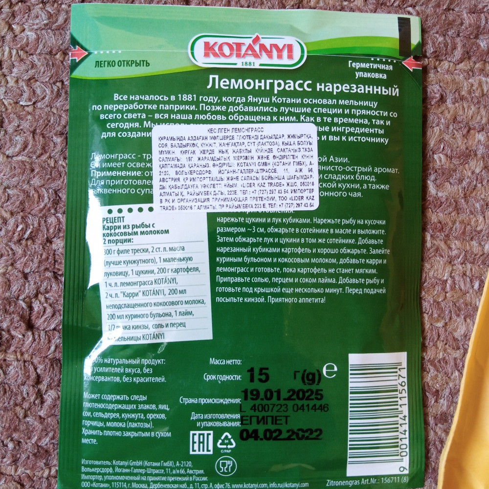 💳 Оплатить за товар можно при получении 🇰🇿 Есть бесплатная доставка по Казахстану от 1 дня 🎁 Копите бонусы с каждой покупки Серия: Зеленая линия Нарезанный лемонграсс Kotanyi — это ароматная трава, которая традиционно используется в азиатской и карибской кухнях. Приправа обладает освежающим цитрусовым вкусом и ароматом с острыми имбирными оттенками. Лемонграсс рекомендуется добавлять к мясу, морепродуктам и блюдам, приготовленным на гриле. Специю можно использовать вместо цитрусовой цедры в десертах, выпечке и напитках. |