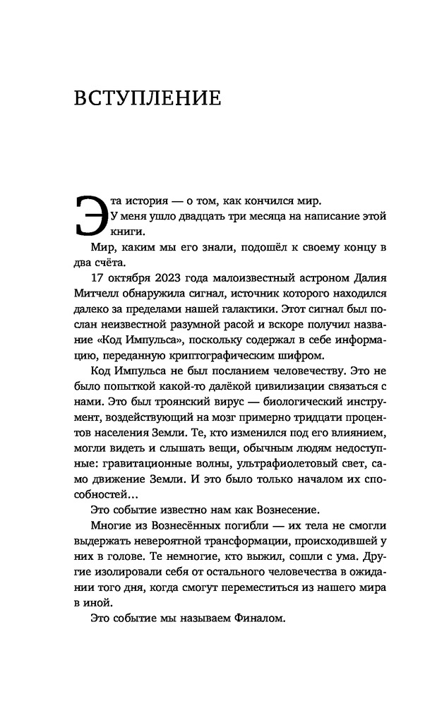 Спустя пять лет после «Импульса» известный журналист Кит Томас решил разобраться в событии, изменившем мир. Томас путешествует по всей стране, берет интервью у членов группы, которая пыталась расшифровать сигнал. Он встречается с астрономами, которые изначально сомневались в открытии Импульса. Именно эта ошибка привела к быстрой гибели мира. Томас общается со свидетелями Вознесения и людьми, чьи близкие исчезли в финале. Перед ним со всех сторон открывается событие, которое и по сей день продолжает озадачивать исследователей и порождает массу теорий о мотивах Высших. |
