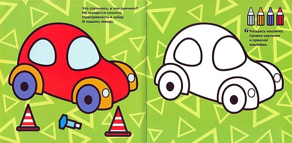 Приклеивая наклейки, можно не бояться сделать это неправильно - они легко отклеиваются от страничек. Картинки выполнены на всю страницу, обведены толстым контуром, чтобы малышу было удобнее их раскрашивать. Также на каждой страничке есть вопросы, которые мама прочитает малышу, и они вместе смогут ответить на них.