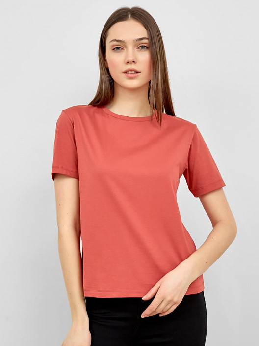 Очень качественный трикотаж и пошив, х/б. Цвет, как на фото, очень понравилась. По размеру - большемерит на 2 размера примерно, на ОБ 104 и ОГ 96 хорошо подошел 44 размер, не в обтяжку.