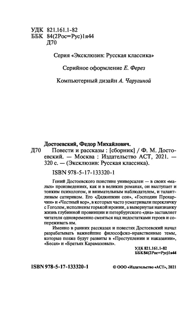 В данный момент этот товар отсутствует в продаже. Возможно, у нас найдется аналогичный или похожий товар здесь. Серия: Эксклюзив: Русская классика Гений Достоевского поистине универсален — в своих «малых» произведениях, как и в великих романах, он выступает и тонким психологом, и внимательным наблюдателем, и талантливым сатириком. Его «Дядюшкин сон», «Господин Прохарчин» и «Честный вор», в которых не однажды усматривали перекличку с Гоголем, исполнены горькой иронии, а вывернутая наизнанку жизнь глубинной провинции и петербургского «дна» заставляет читателя одновременно смеяться над недостатками героев и сопереживать им.