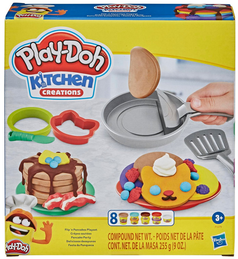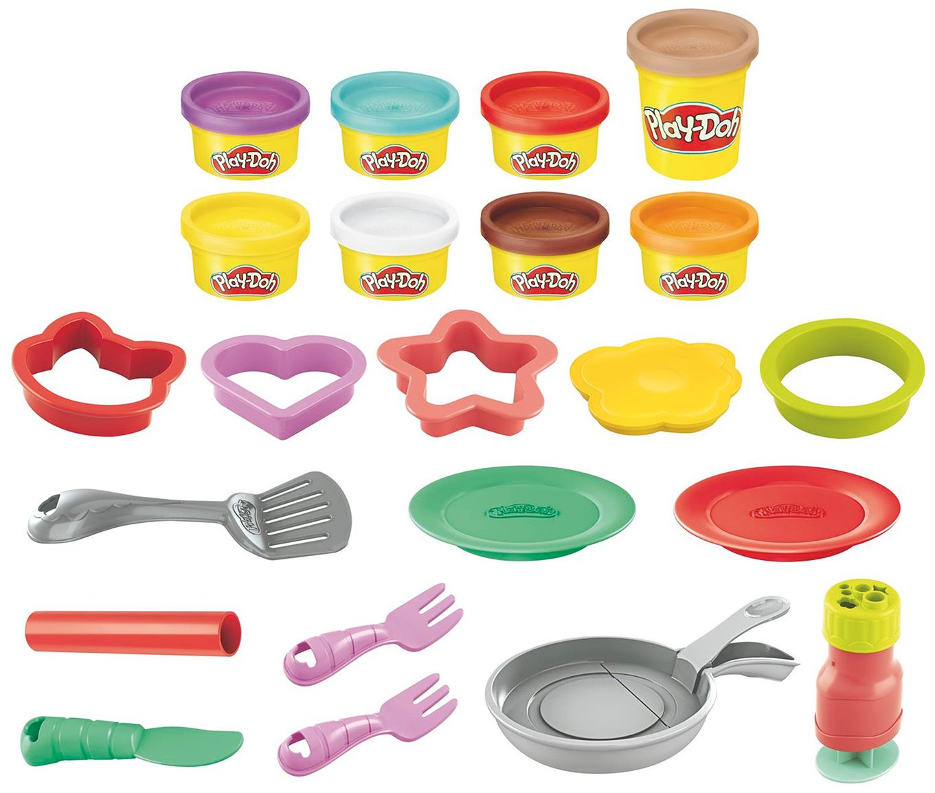 Набор Play-Doh для приготовления игрушечных блинчиков «перевернет мир» вашего ребенка! С ним малыш сможет представить себе, как готовит самый настоящий завтрак, ловко подбрасывая блинчики с помощью кнопки на ручке сковороды. В наборе есть 4 разные формочки и 8 баночек разноцветной массы для лепки — аппетитные блины можно украсить так, как подскажет богатая детская фантазия! Набор станет замечательным подарком по случаю дня рождения или другого праздника для малыша, любящего творчество.