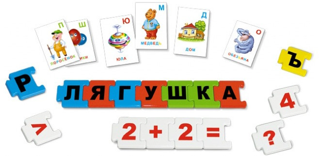 Игра в занимательной форме с помощью карточек с картинками и буквами-пазлами познакомит вашего ребенка с алфавитом, звуками, слогами и словами нашего языка. А также научит совершать простейшие арифметические операции!