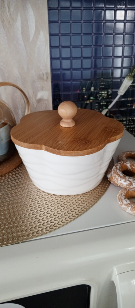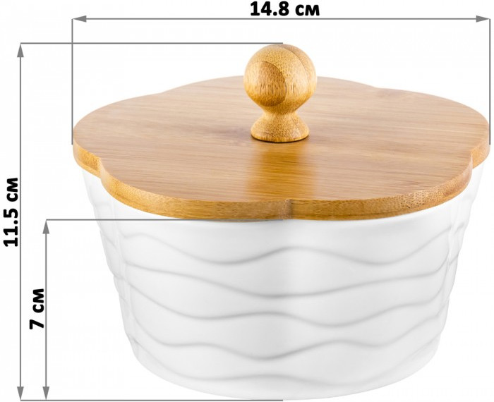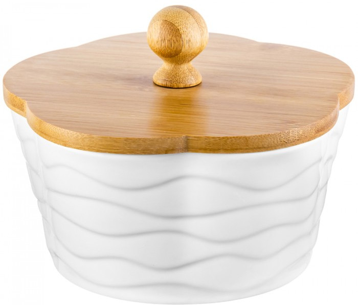 Банка в форме цветка серии «Айсберг волны» объемом 760 мл подойдет для хранения и подачи печенья, конфет и других сладостей. Банка выполнена из высококачественного фарфора и украшена рельефными узорами. Крышка банки выполнена из бамбука и имеет удобную ручку.